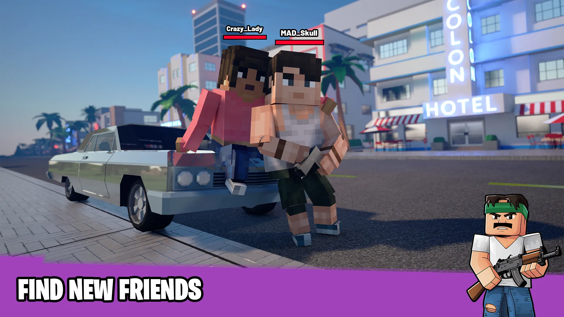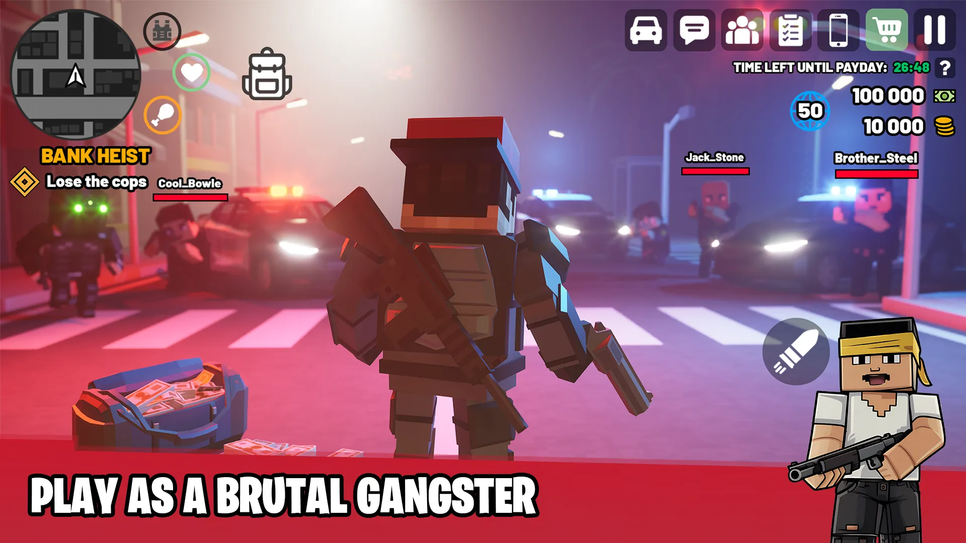 Block Crime Mafia is a RolePlay game with an open world, online RP mode with friends and a single game on a large map. Meet a mafia city Los Palms, start your business, complete freedom and no boundaries! Best gangster games and crime games like life simulator Block Crime Mafia gives you opportunity to go the way of a usual thug, a role-playing game where you can become a gang leader in block city of Los Palms. A mafia games in an open world of criminal wars, cool action, wars, shootouts and races are waiting for you. Complete exciting missions from mafia bosses, choose the fastest cars and the biggest guns, the RP game begins. Decide who you are in the criminal city of Los Palms, a law-abiding citizen or a mafia gangster, godfather in the criminal hierarchy. Or maybe you are a businessman who bought up all the companies in the city or the owner of elite real estate. Maybe you are a police chief who is tough on crime! Compete online with your friends and thousands of other players for the title of the best gangster. We have prepared hundreds of pixel skins and weapons wih full. The cubic first-person and third-person block shooter Block Crime Mafia Online is a masterpiece of pixel graphics and impeccable action, a multiplayer 3D shooter with block graphics, pixel gun 3d and amazing gameplay. You can create a gang, win together in fierce battles for areas and territories of this PvP pixel shooter. If you like role-playing mission games, this is the best life simulator for you. The city of Los Palms is mired in crime, even in the quietest area there is gunfire and police sirens. But at the same time, there are big parties on the shore near vice hotels, people party on luxury yachts until the early hours, and crazy street races never stop on the streets, street racers tune their cars, and cops catch robbers. In this action shooter, you can join different factions: street gangs, police, special forces, military. Each faction has its own tasks with fast transport races like in racing games. Take part in robberies, races, shootouts and territory captures using a variety of weapons. Block Crime Mafia is the best pixel graphics, a multiplayer game for everyone! Make new acquaintances, communicate via voice chat, make plans to capture new territories. Invite friends to your apartments and throw loud parties. You can also take part in joint online missions, help each other in business. Interact via microphone and chat, plan and participate in heists with four players, destroy competitors in PvP block city wars in real time. Try the unique "Heist" payday mode, a minigame in the best traditions of Payday and payback with robbers. Amazing graphics and high-quality optimization make the game the best block FPS. Capture the streets to get more money. Improve your hero to become stronger and modify weapons to win the gang war. Steal competitors' transport to gain a tactical advantage. Use any means to capture Los Palms. You are the hero and the creator of your roleplay history in Block Crime Mafia: Online RP! - open world of gangsters, criminal sandbox with complete freedom of action - Online RP mode, PvP battles, mini games: deathmatch and unique "Heist" mode with cops and robbers ...