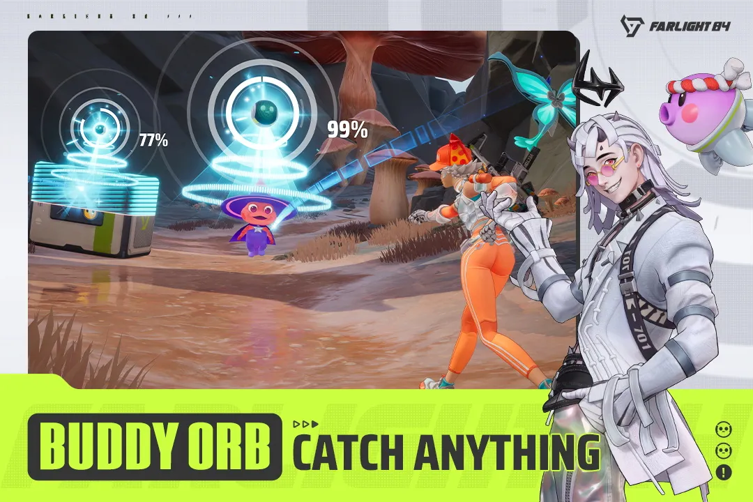 Catching pets in a Battle Royale? Absolutely! In Farlight 84, you get to play as heroes with unique skills to outsmart your enemies, unleashing special abilities to catch them off guard... AND you get to collect adorable Buddies to join you as loyal companions in battle. Buddy up, it’s time to Battle Royale! Buddy Orb - Catch Anything Just aim and throw--Buddy Orb lets you store vehicles, bunkers, and adorable Buddies, making them ready to deploy at critical moments. ...