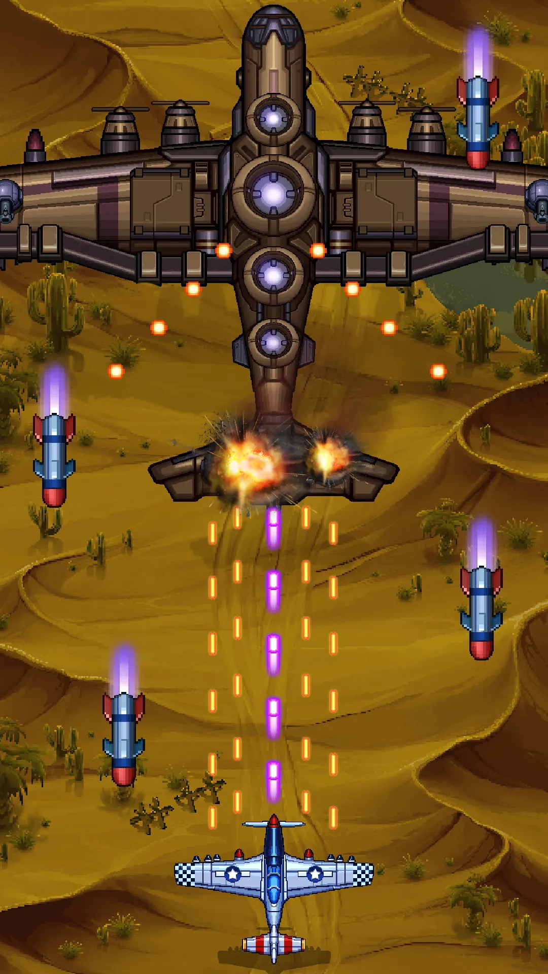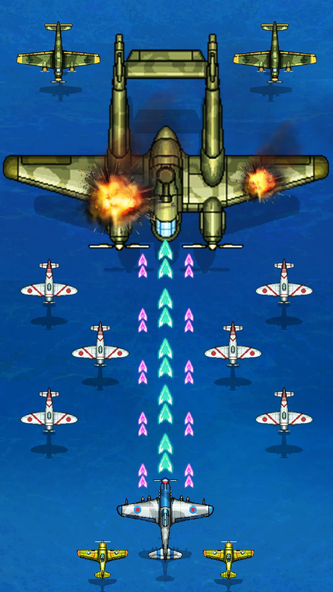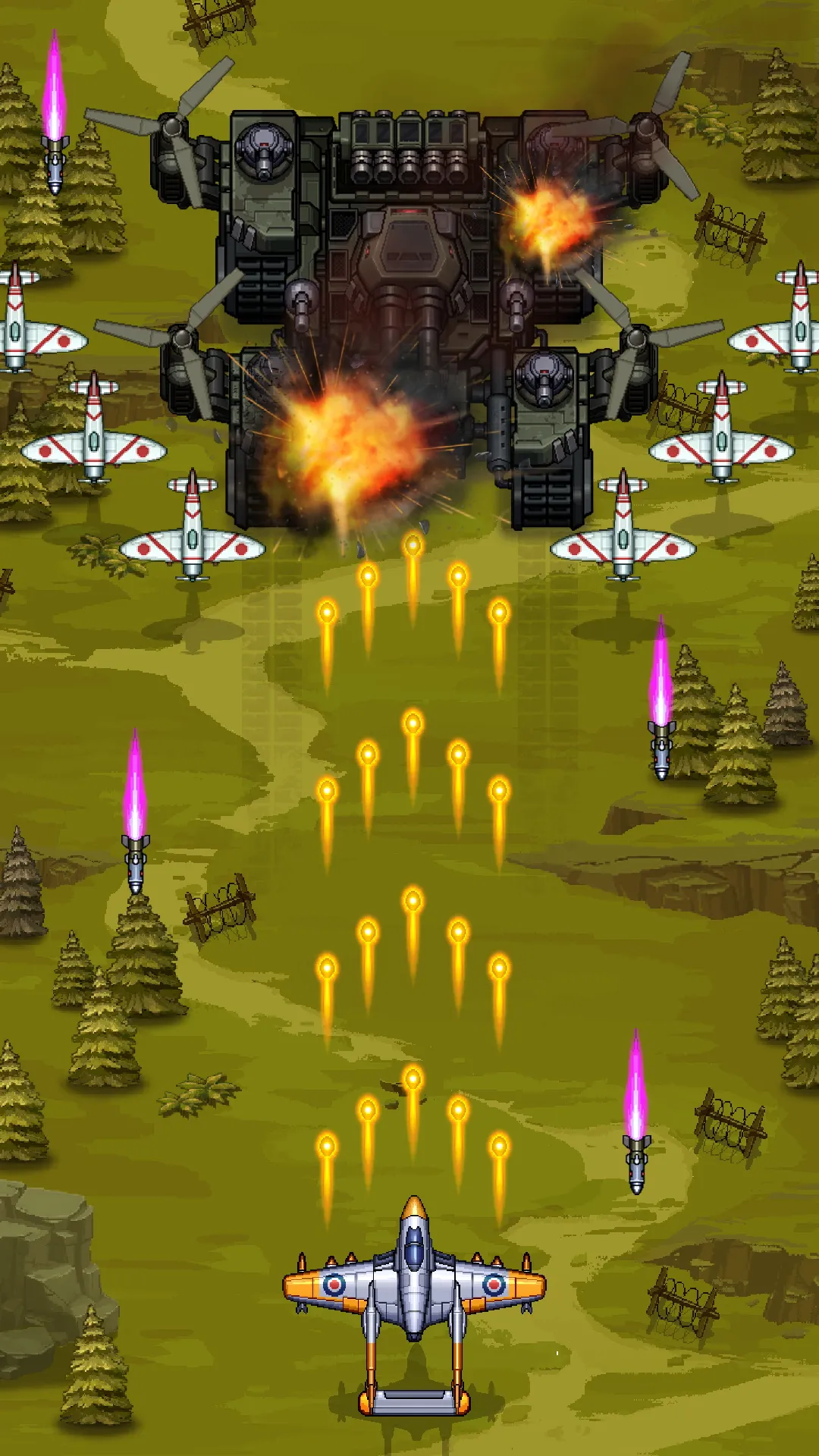 1940 Air Fighter is an arcade shooting game of 80s that makes you feel like you are playing a classic vertically scrolling shooter game on mobile. Take control of a single-seat, twin piston-engined fighter aircraft and jump on the battlefield now! You will fight against realistic historical airplanes like Lockheed P-38 Lightning, Kawasaki Ki-61s, Mitsubishi A6M Zeros, Nakajima G10N, Grumman F6F Hellcat, B-17 Flying Fortress, ... to modern generation military aircraft. Pilot your super ace fighter to shoot down enemy planes and destroy the enemy air fleet today! 1940 Air Fighter Features: - Shoot ‘em up retro style...