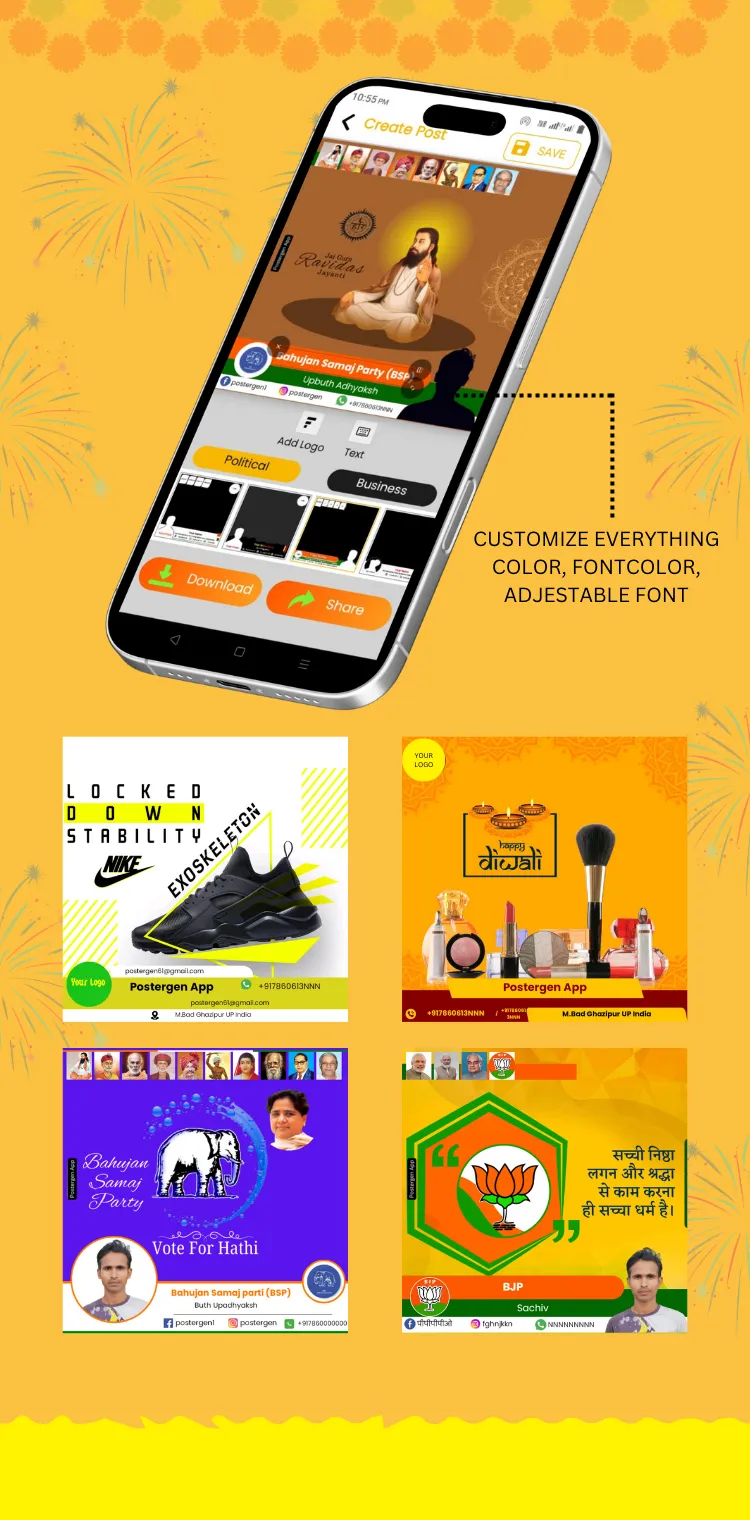 Postergen Political poster maker or political poster app can help individuals and platform create professional-looking poster maker & banner maker for political campaigns or doing Poster prachar in your with saral festival poster. Postergen political post से आप आसानी से किसी भी उद्देश्य के लिए सुंदर पोस्टर डिजाइन कर सकते हैं। पोस्टर ऐप में कई विशेषताएं हैं जिससे आप रोजाना लगने वाले पोस्ट जैसे Festival, Jayanti, Sports, Foundation Day, Business, Devotional, and Other Poster & Banner के साथ राजनैतिक पोस्ट भी बना सकते है | पोस्टर App आपकी Post बनाने में मदद करता है चाहे Political हो Festival, BJP or मोदी के पोस्टर से लेकर राहुल गांधी के पोस्टर तक, इस ऐप में सब कुछ है। App को नए डिजाइनों के साथ लगातार अपडेट किया जाता है Postergen Poster App पर आपको हर तरह के डिजाईन टेम्पलेट मिलते है जैसे -...