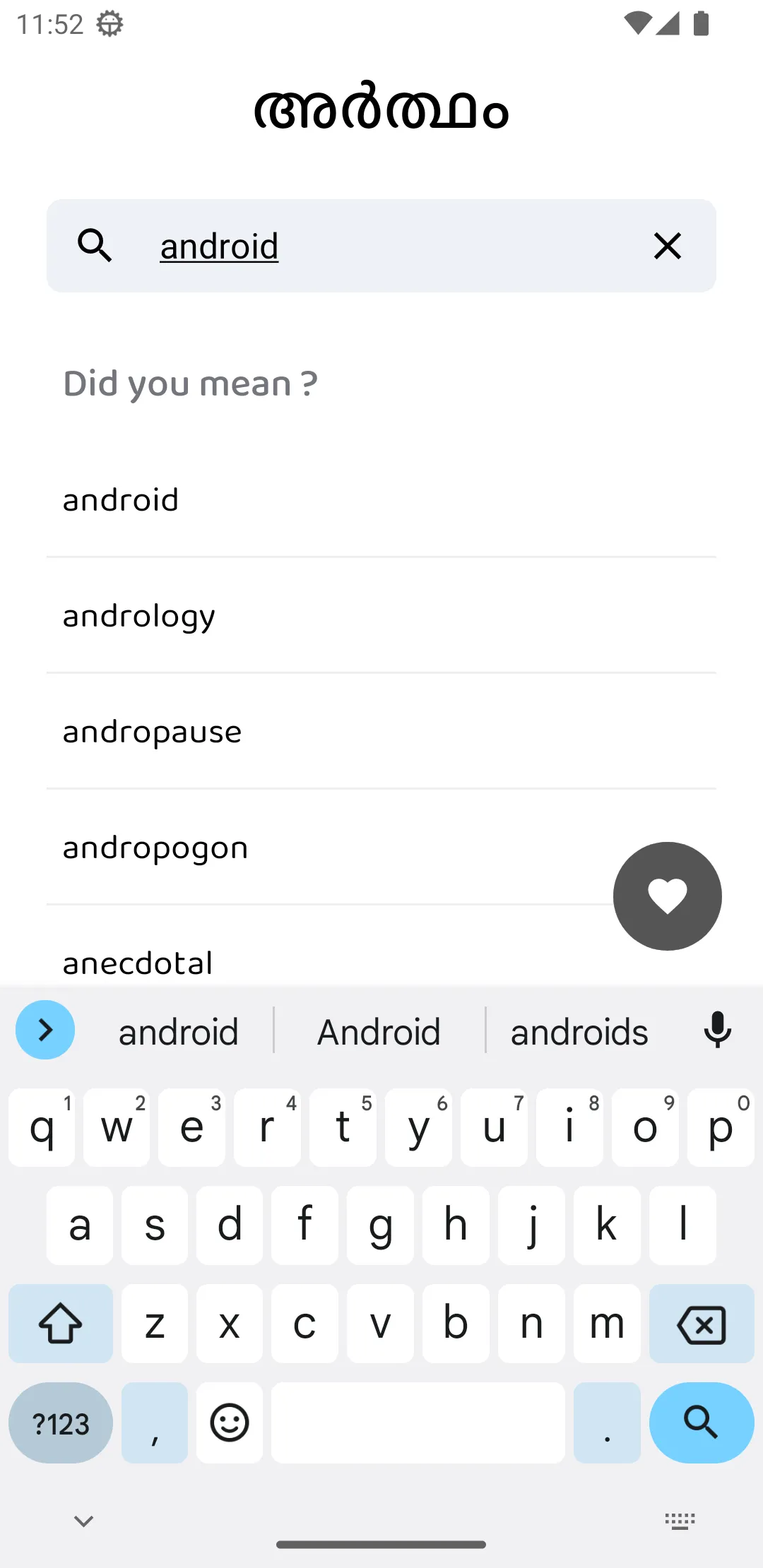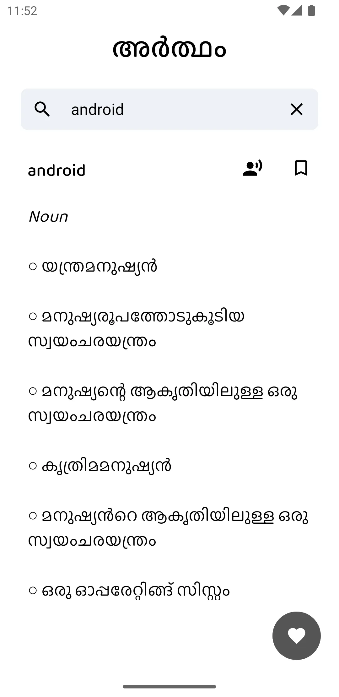 Artham(അര്ത്ഥം) is a lite version of Olam dictionary (https://olam.in). It is completely offline, has the largest database with over 2,15,600+ definitions, yet being the smallest app in the Google Play Store. It also has an intelligent clipboard capture system to easily bring the meaning of the word you are looking for. BIGGEST Artham has a huge database with over 2,15,600+ definitions. This includes words, phrases and idioms. It is powered by the "Olam English-Malayalam dataset" developed by Kailash Nadh. It is an open source growing crowd sourced database. All the credits for the database goes to him....