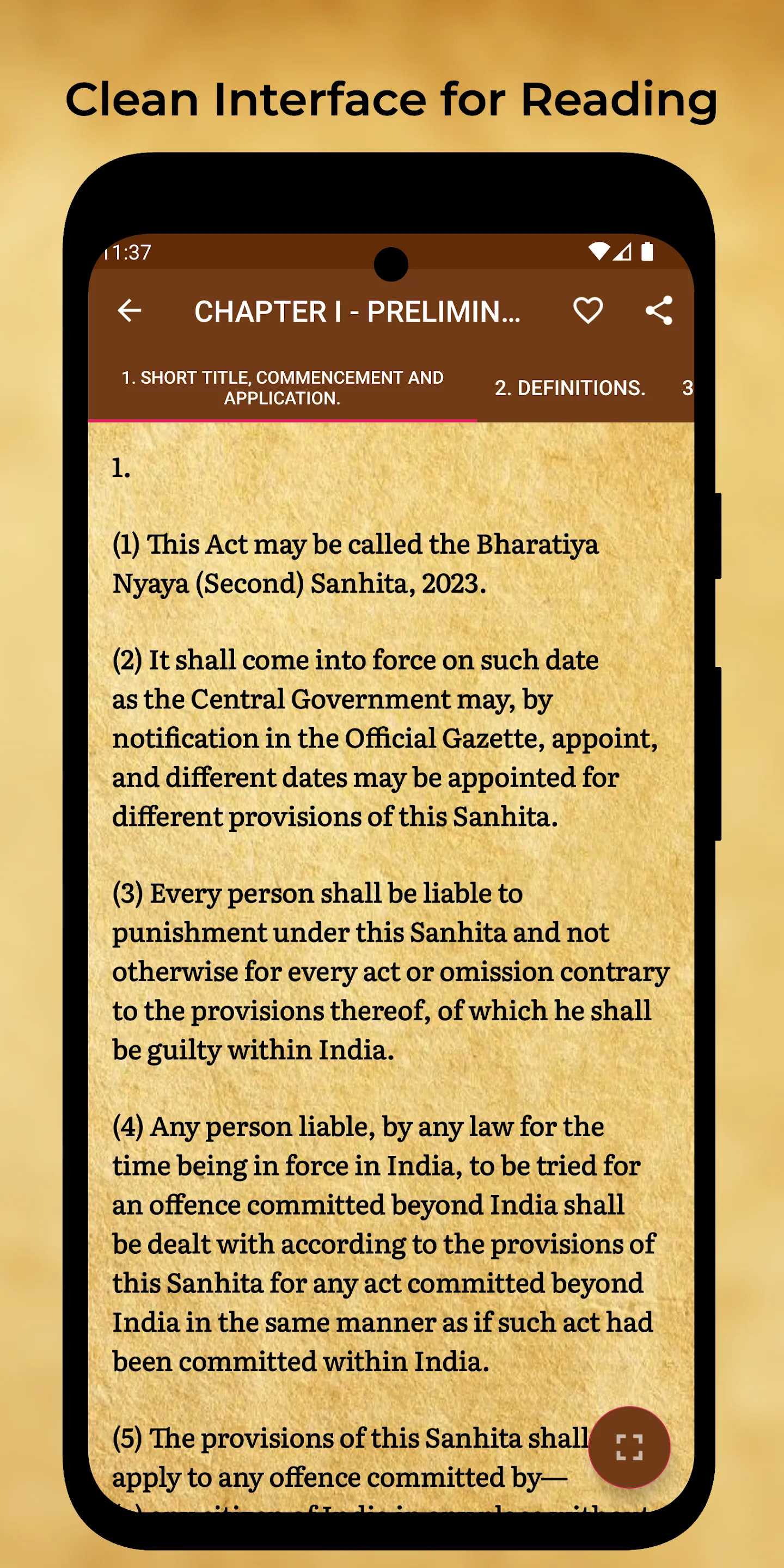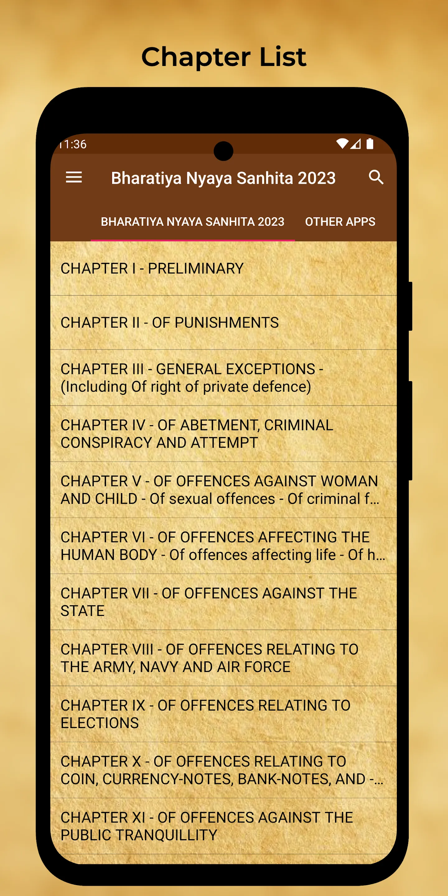 Disclaimer: This application is not affiliated with or representative of any government entity. It is a private platform developed for Educational Purpose. Any information or services provided by this app are not endorsed or sanctioned by any government authority. Content source: https://sansad.in/getFile/BillsTexts/LSBillTexts/PassedLoksabha/173_C_2023_LS_Eng12212023101409AM.pdf?source=legislation The Bharatiya Nyaya Sanhita or Indian Justice Code ( commonly referred to as BNS ) is the criminal code in the Republic of India. The Bharatiya Nyaya Sanhita is subdivided into 19 chapters consisting of 356 sections. The structure of the code is similar to the Indian Penal Code. ...