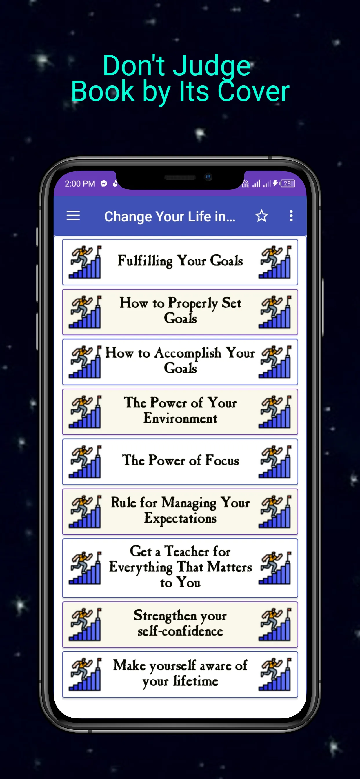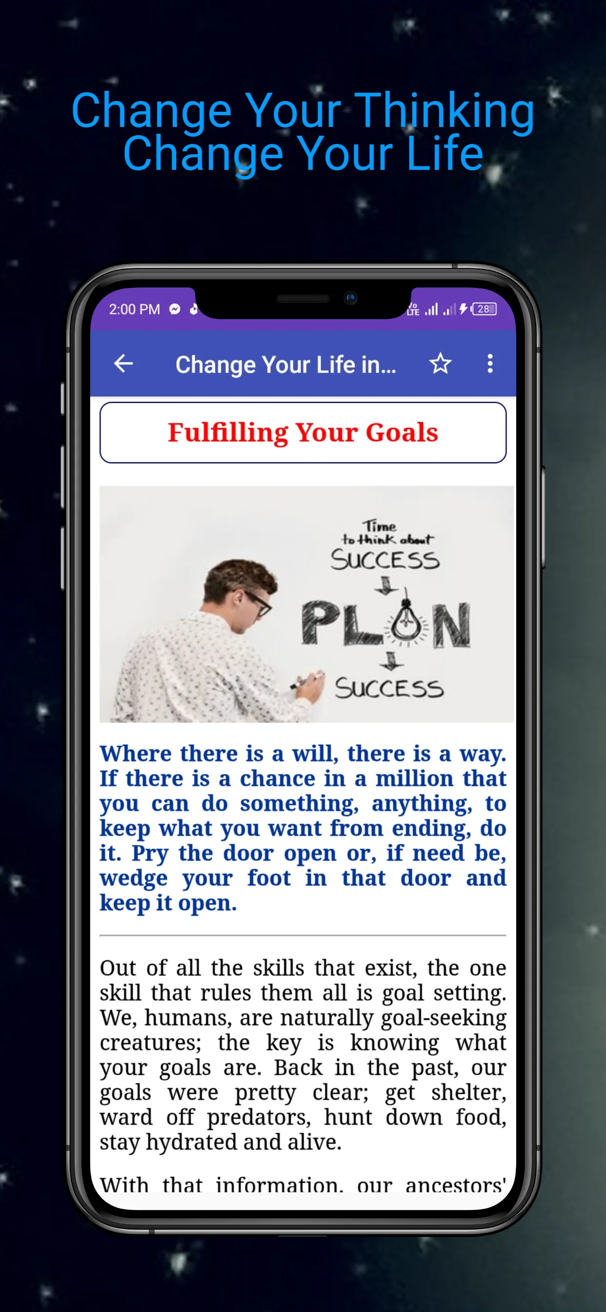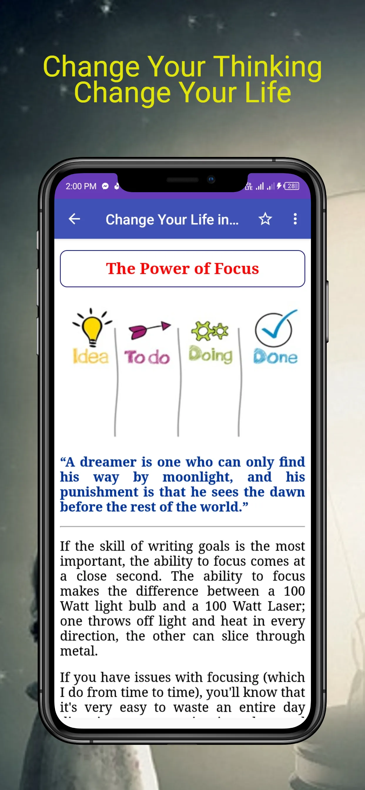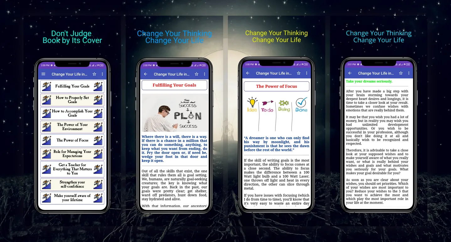 As a human, we want to be a successful people but we are not proper guidelines to become a successful people. For this reason, we made this Change Your Life in a Week app so that you become a successful person and think as successful people think. If we become successful people then firstly, we must set up a goal and change our thinking. This app is goal setter app, aim assist app, daily goal planner app, financial goal planner personal goal planner study goals planner weekly goal planner yearly goal planner, and so on. So, for this reason, this changes your thinking and change your life app reaches your last destination of success. Most apps like change your thinking change your life free books app, change your thinking book app and how to change your thinking app are a goal planner app but there are no proper guidelines for you because there have a lake of idea and lake of information added. So, I hope this Change Your Life in a Week app helps you in many ways because it is not only a goal setting app but also it is a success journal. For this reason, you should be using this app for your help. Change Your Life in a Week teaches you how to change your mind and build a strong mindset in a short time that becomes the power of your mind. There is no lake in this apps and added proper guidelines about Change Your Life in a Week so, you must keep these successful thinking strategies app and change your life very short time. ...