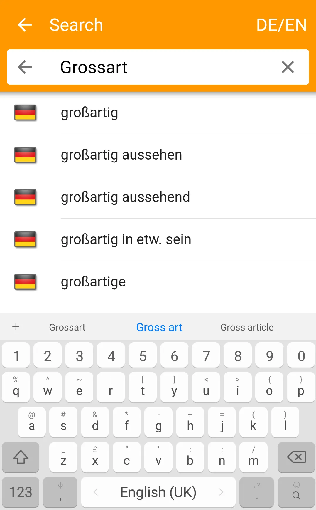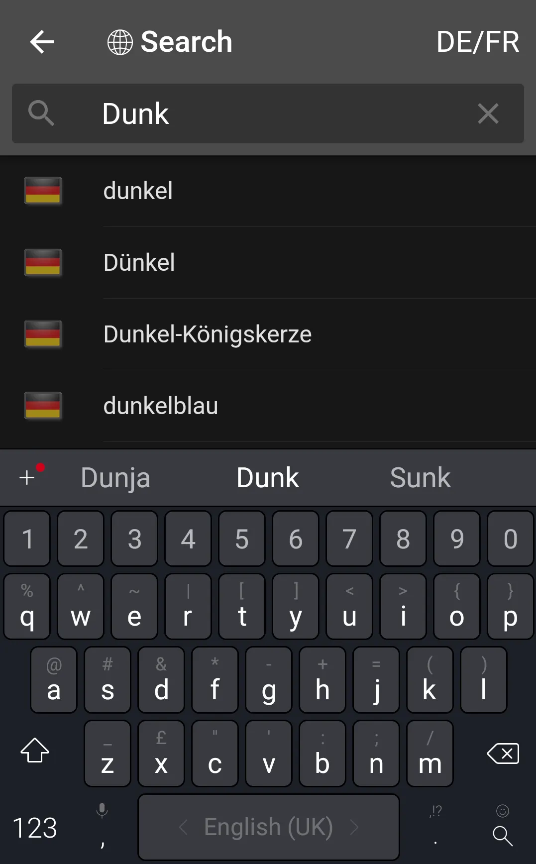Dictionary for 51 language combinations, usable without an internet connection (offline dictionary). Vocabularies can be downloaded and updated within the app for free. All dictionaries are bidirectional, so German-English doubles as English-German. Just type in your keyword in either language. English-German dictionary: 1 million translations The following languages are available in combination with German and English: Albanian, Bosnian, Bulgarian, Croatian, Czech, Danish, Dutch, Esperanto, Finnish, French, Greek, Hungarian, Icelandic, Italian, Latin, Norwegian, Polish, Portuguese, Romanian, Russian, Serbian, Slovak, Spanish, Swedish, Turkish...