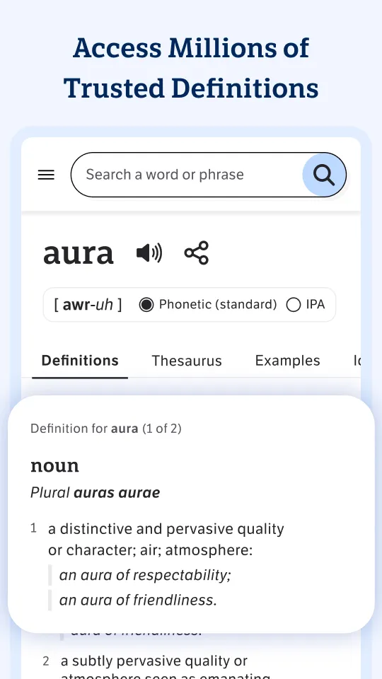 Download the #1 free dictionary app! With more than 2 million trusted definitions and synonyms, this English dictionary and thesaurus app for Android is optimized for your mobile device. Improve your English vocabulary, whether you're just starting your learning journey or you're already a word wizard. Install the app for access to definitions and synonyms whenever and wherever you need them — no bulky books necessary. Flip to dark mode to give your eyes a break, or stick to the traditional set-up. In addition to the trusted reference content from Dictionary.com and Thesaurus.com, this education app includes: ...