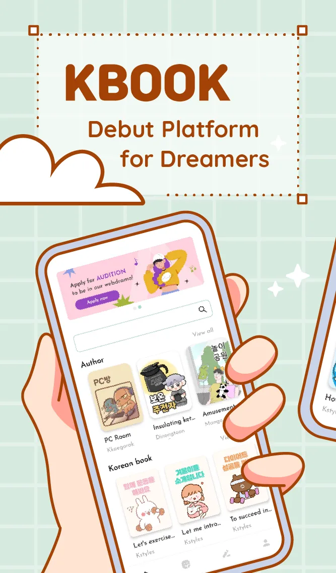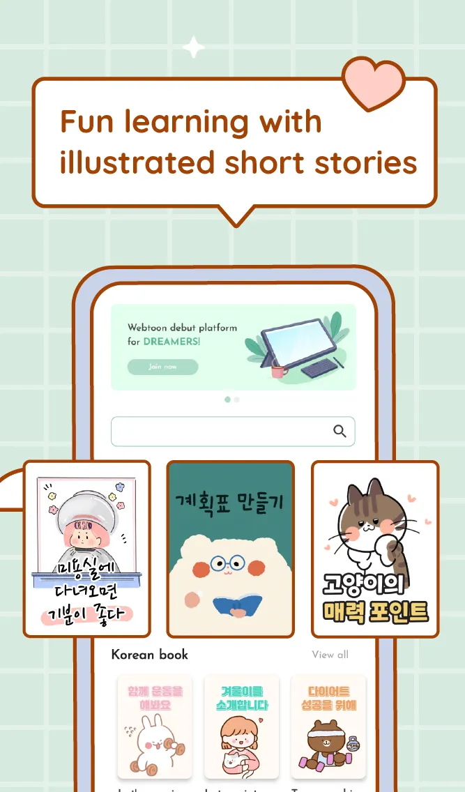 Welcome to KBOOK. We hope to assist you in learning Korean through daily life story comics or webtoons. KBOOK goes beyond a simple learning platform. Amateur authors can gain valuable experience by creating content and debuting as webtoon writers. The content created by these authors serves as reading material for learning Korean, fostering growth for all involved. In 2023, the KBOOK app was selected as one of the top 3 nationwide, receiving government support and contracting 120 authors. ...