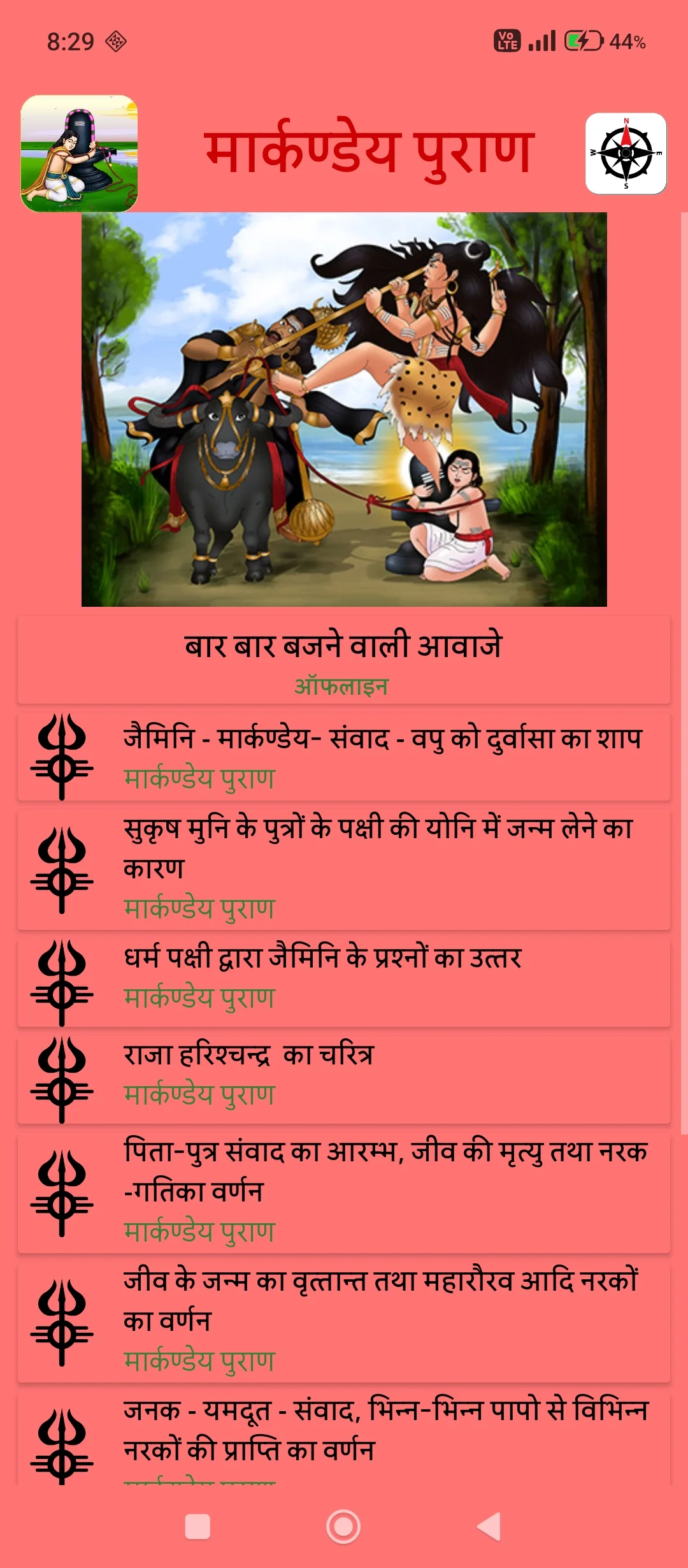 इस एप्लिकेशन में मार्कंडेय पुराण का पूरा वर्णन किया गया है। जिसमे मार्कण्डेय जी शिव लीलाओ और नर्क स्वर्ग का ज्ञान दे रहे है। दत्तात्रेय जी, श्राद्ध कर्म , योग , ब्रह्मा जी की आयु , जम्बूद्वीपो का वर्णन , राजा उत्तम , मनु की उत्पत्ति, मन्वन्तर, महिसासुर, धूम्रलोचन वध, चण्ड और मुण्ड का वध, रक्तबीज-वध, निशुम्भ-वध, शुम्भ-वध, नवें से लेकर तेरहवें मन्वन्तर तक का संक्षिप्त वर्णन, दिष्टपुत्र नाभाग का चरित्र, राजा नरिष्यन्त और दम का चरित्र का वर्णन किया गया है।