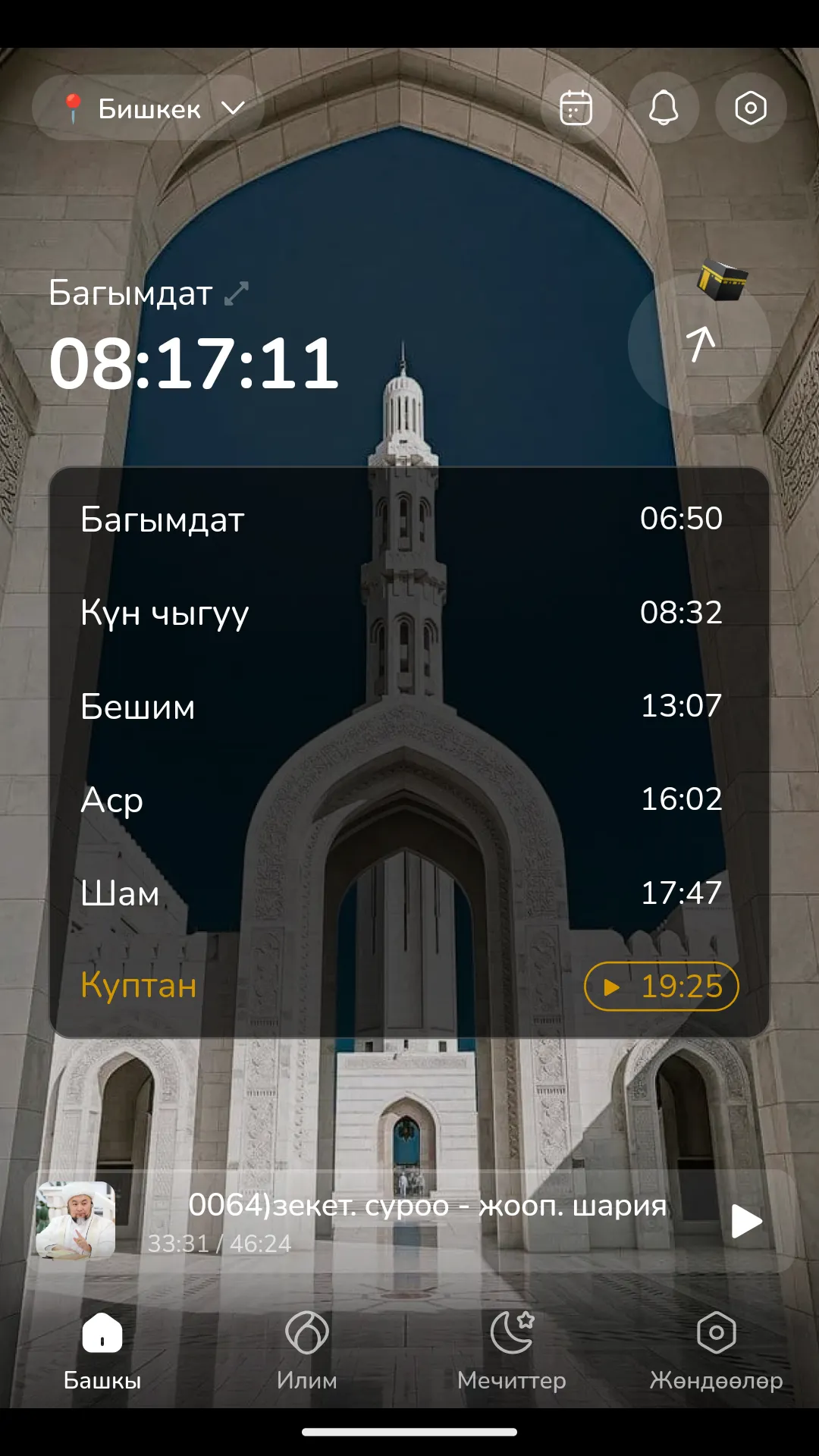 App contains following features - Prayer times for cities around the globe - Online radio (for now in kyrgyz/russian language) - Find mosques and prayer rooms/prayer places nearby to perform a prayer with information of their open time, address, distance from your current location, etc. - Kaza (Skipped) prayers filling calendar/spreadsheet - Creatings Notes for each day/between prayer times.