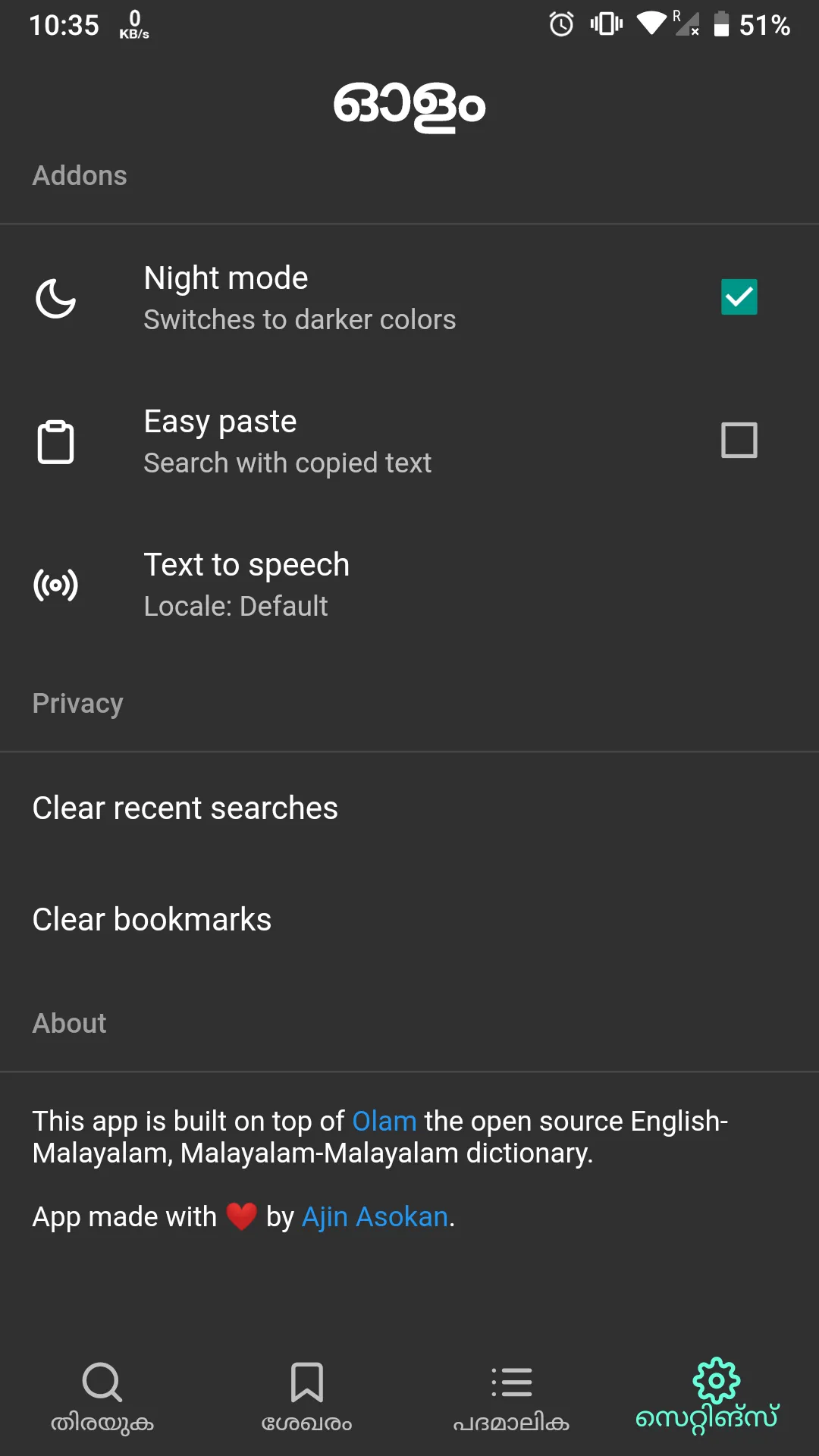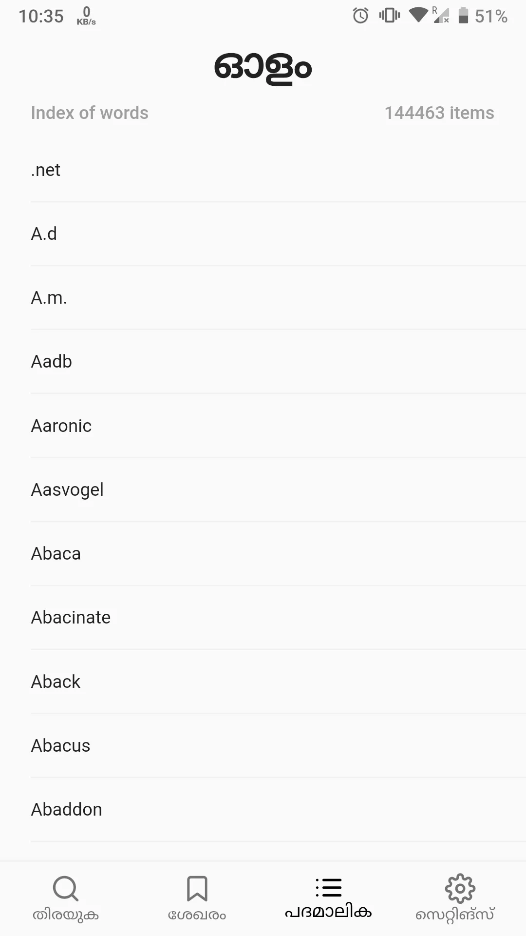The official Android app of Olam, the fast English - Malayalam dictionary. Quickly search for hundreds of thousands of definitions of English words. ഓളം നിഘണ്ടുവിന്റെ ആൻഡ്രോയ്ഡ് ആപ്പ്.