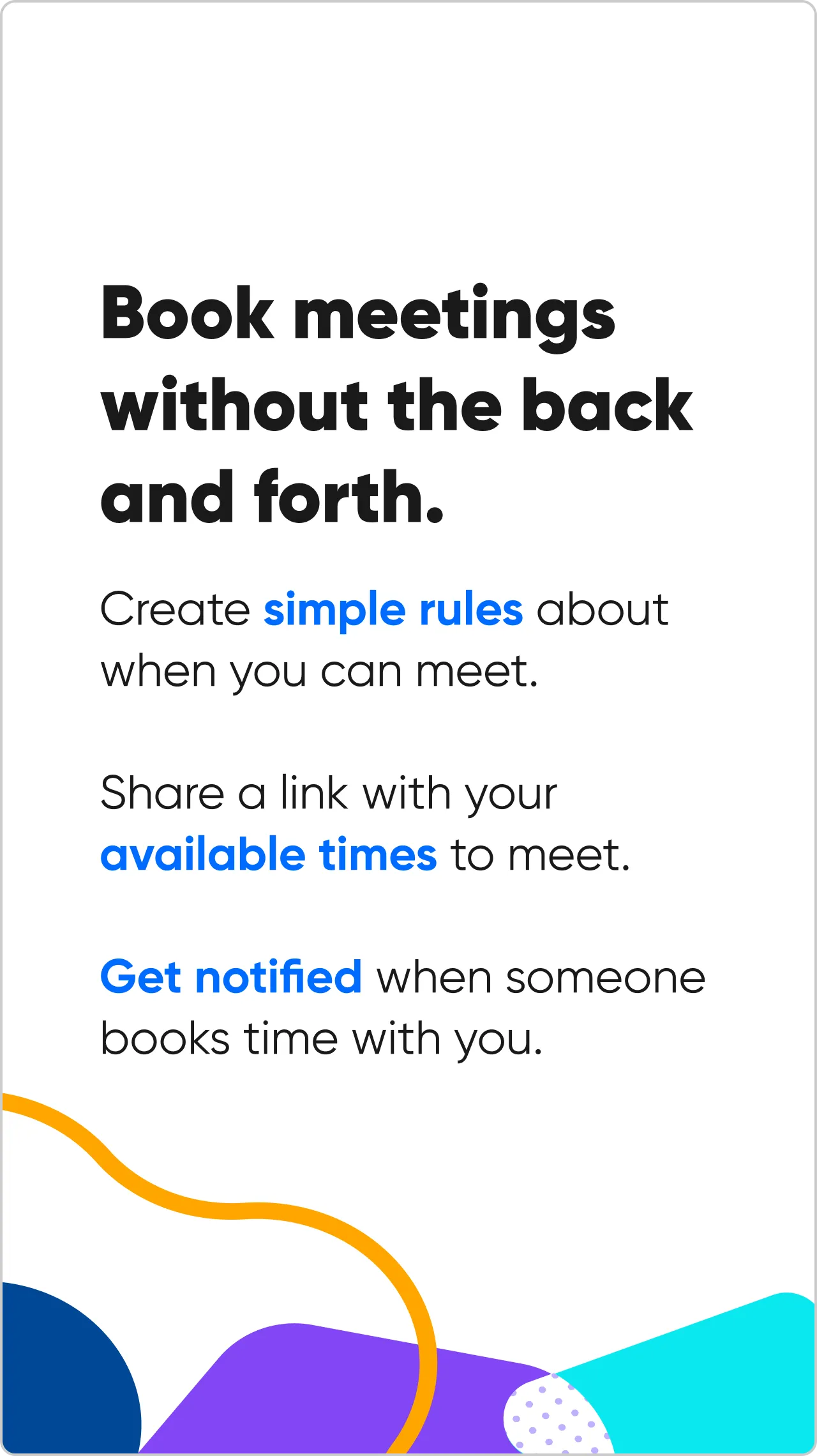 We take the work out of connecting with others so you can accomplish more. HOW IT WORKS • CREATE SIMPLE RULES: Setup is easy. Let Calendly know your availability preferences and it’ll do the work for you. • SHARE YOUR LINKS: Quickly copy your Calendly links and paste them into an email, text, or any other app, saving you time while you’re away from your computer....