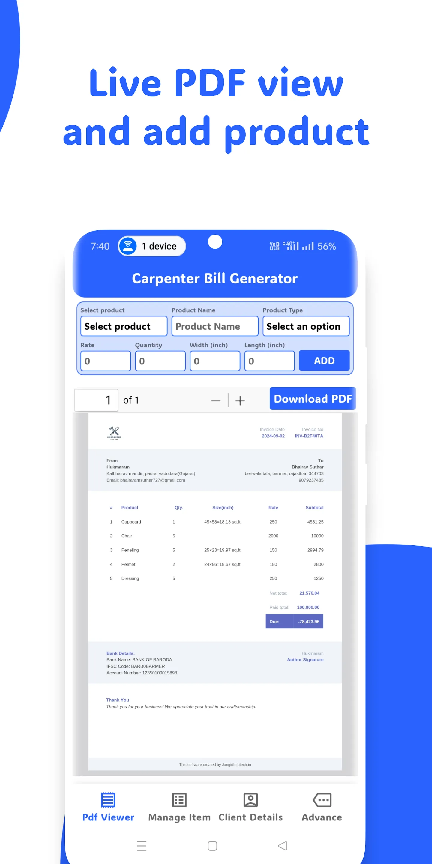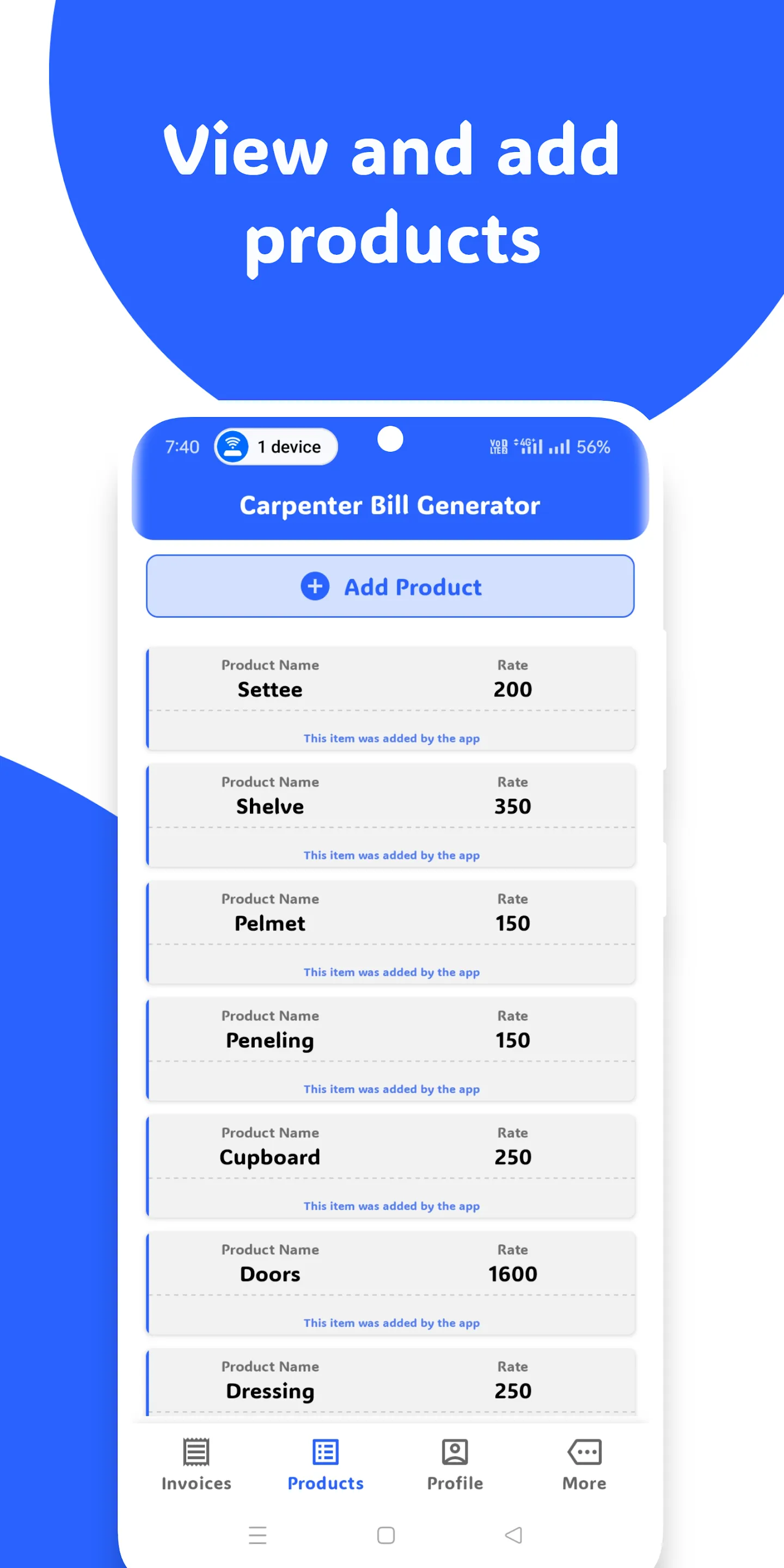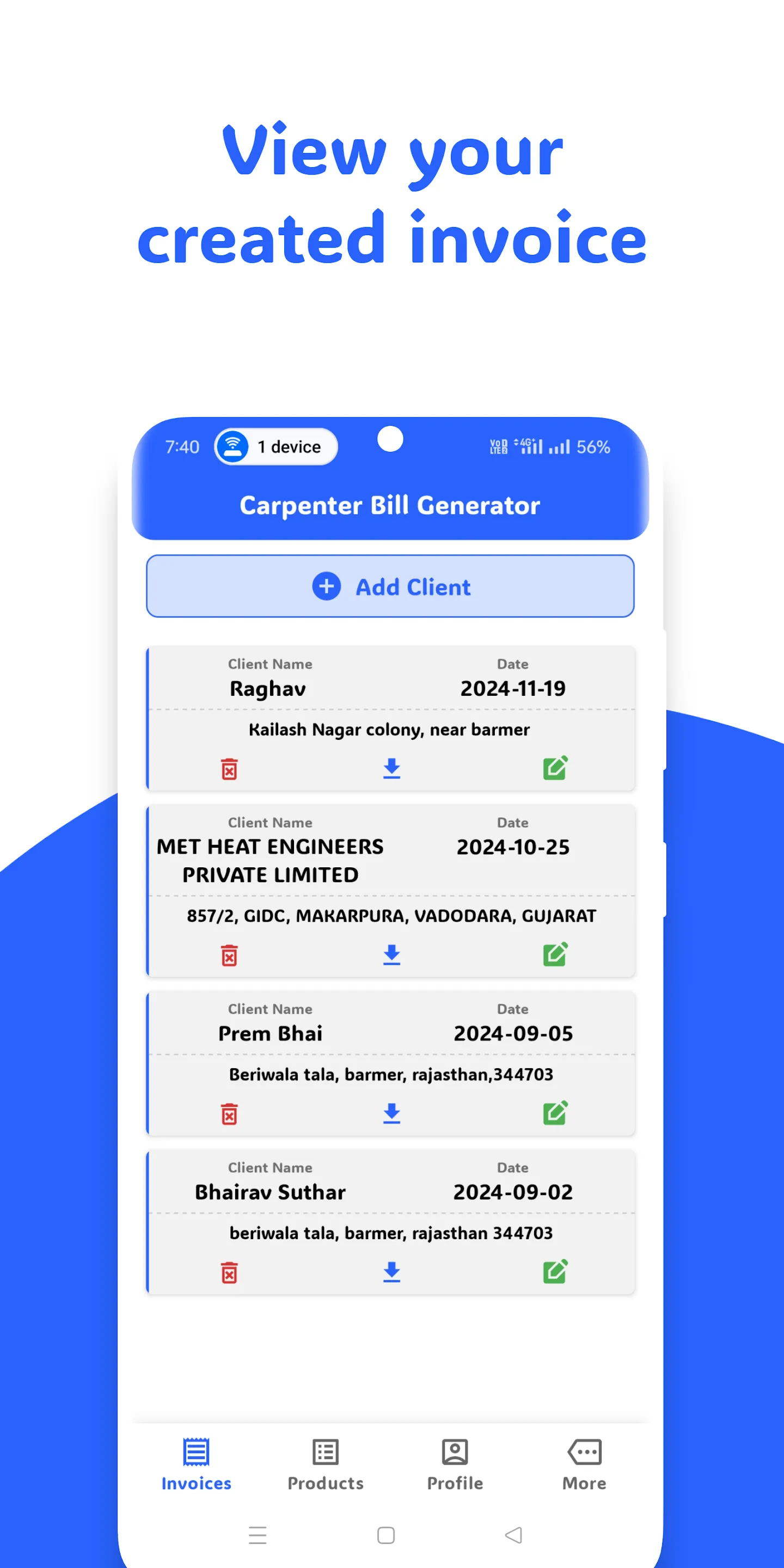 The Carpenter Bill Generator is designed specifically for carpenters and professionals in the woodworking industry to easily manage their billing tasks. With this app, users can efficiently create, manage, and send invoices to clients. Key features include: Client Management: Easily add and store client details for quick access. Itemized Billing: Add items, services, and materials to invoices with their respective costs and quantities. PDF Invoice Generation: Automatically generate professional PDF invoices that you can download or share with your clients. Customizable Invoices: Tailor your invoices with custom information to fit your business needs....