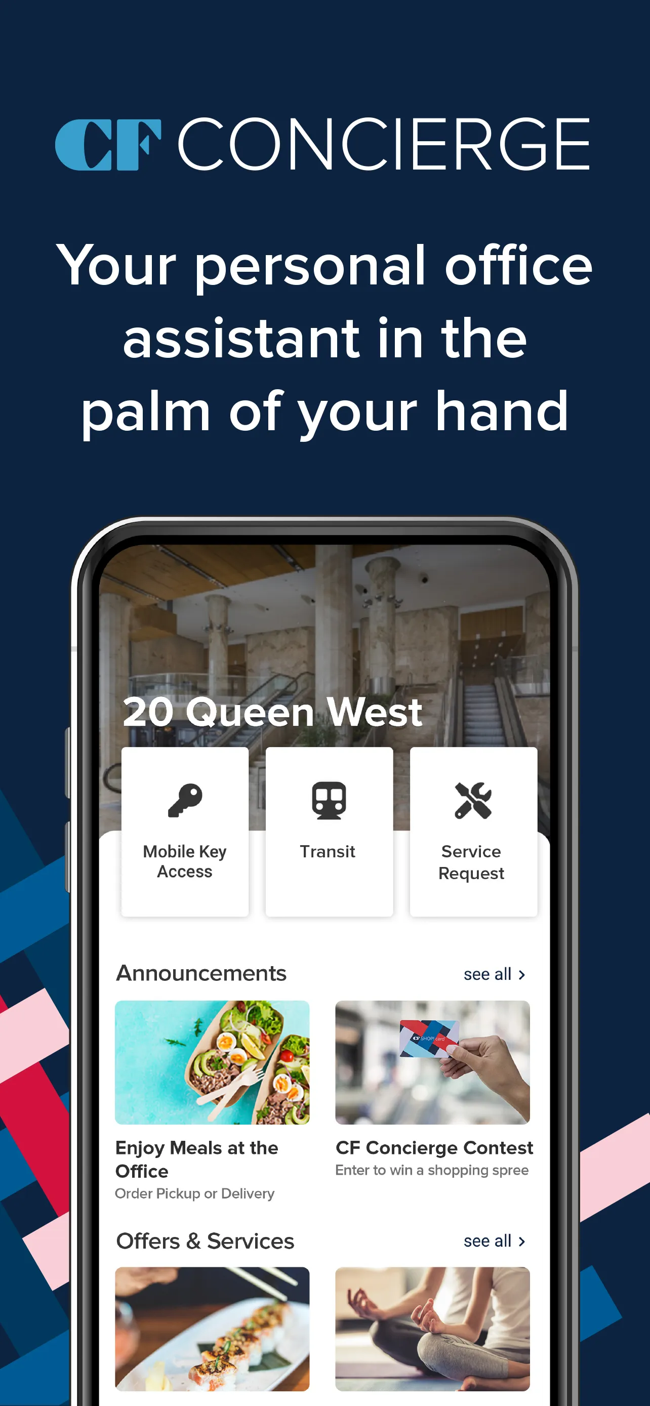 CF Concierge is a convenient and intuitive mobile app designed for occupants of participating CF offices to enhance and compliment your work day. Whether you're at the office or working remotely, CF Concierge serves to help you cultivate a workplace environment that fosters engagement, productivity, & well-being. App features include: Mobile Key Access: A digital passcard residing on your device which provides convenient, mobile access to your office building. ...