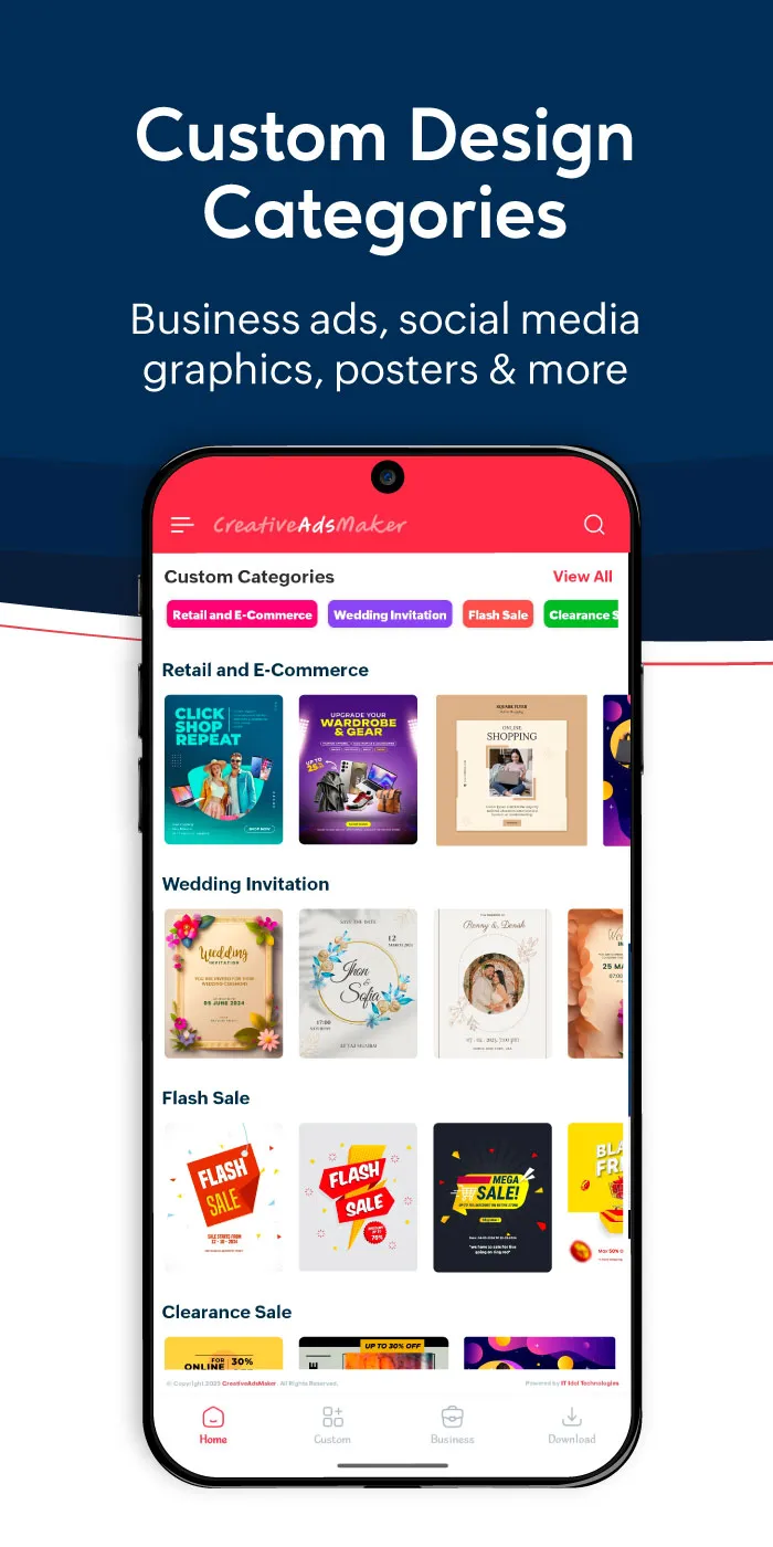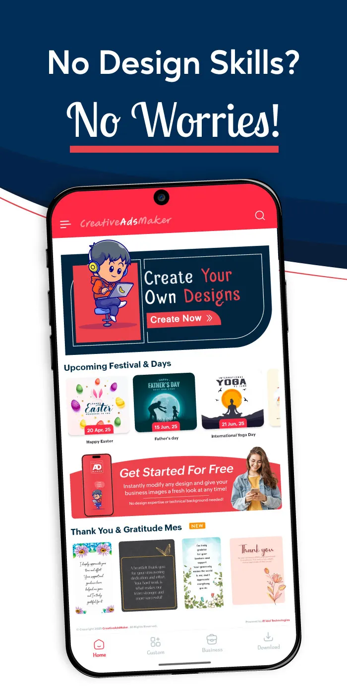 Easily create stunning social media posts, business ads, and promotional posters with Creative Ads Maker. Whether you're a business owner, marketer, or content creator, this app helps you design professional-quality visuals effortlessly—no graphic design skills required! Key Features: ✔ Easy-to-Use – Create eye-catching designs with a simple interface ✔ Ready-Made Templates – Access 500+ templates for business, festivals & promotions ✔ Customizable Designs – Edit text, colours, fonts, and images to match your brand ✔ High-Quality Exports – Download and share your designs instantly...