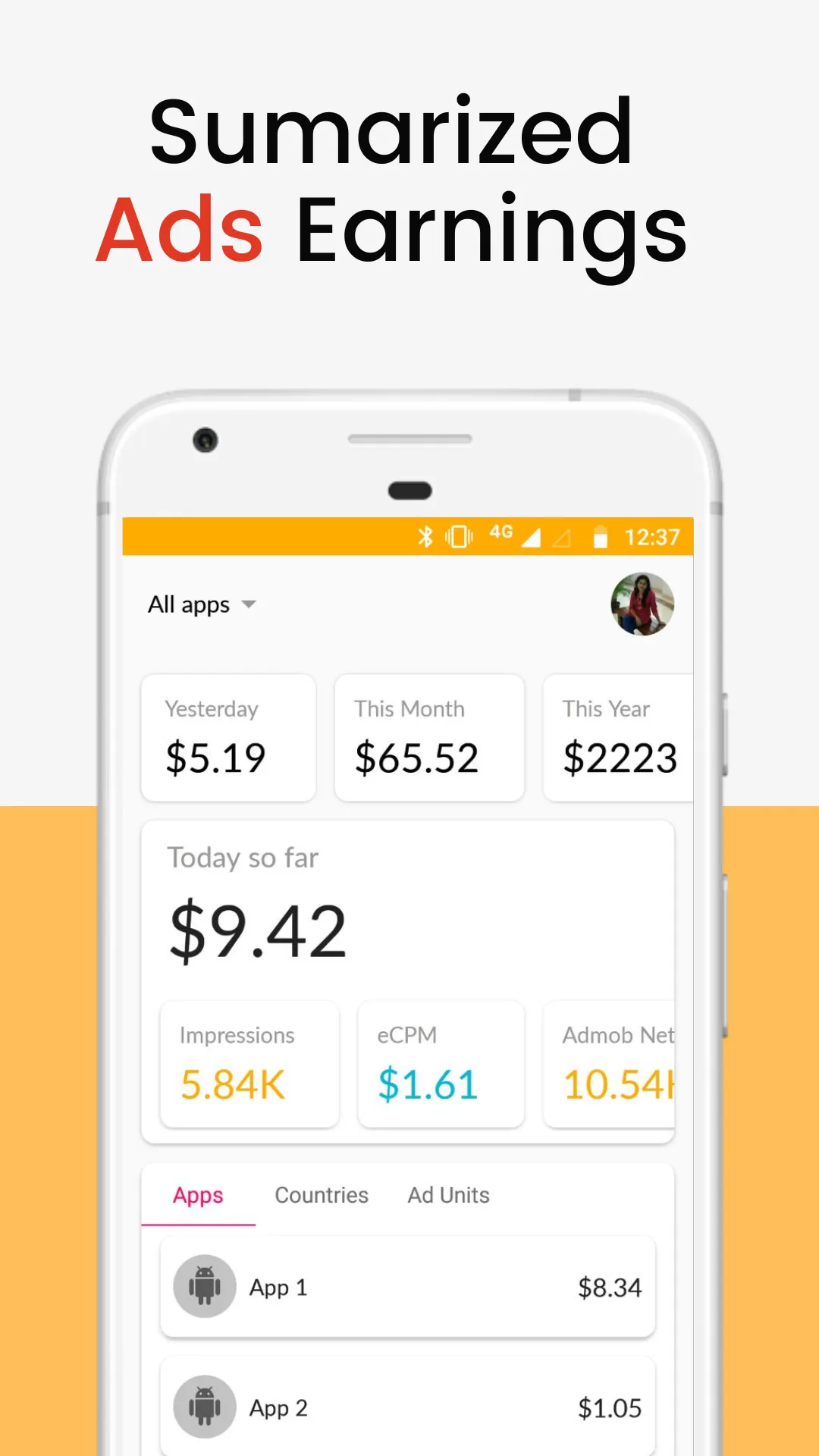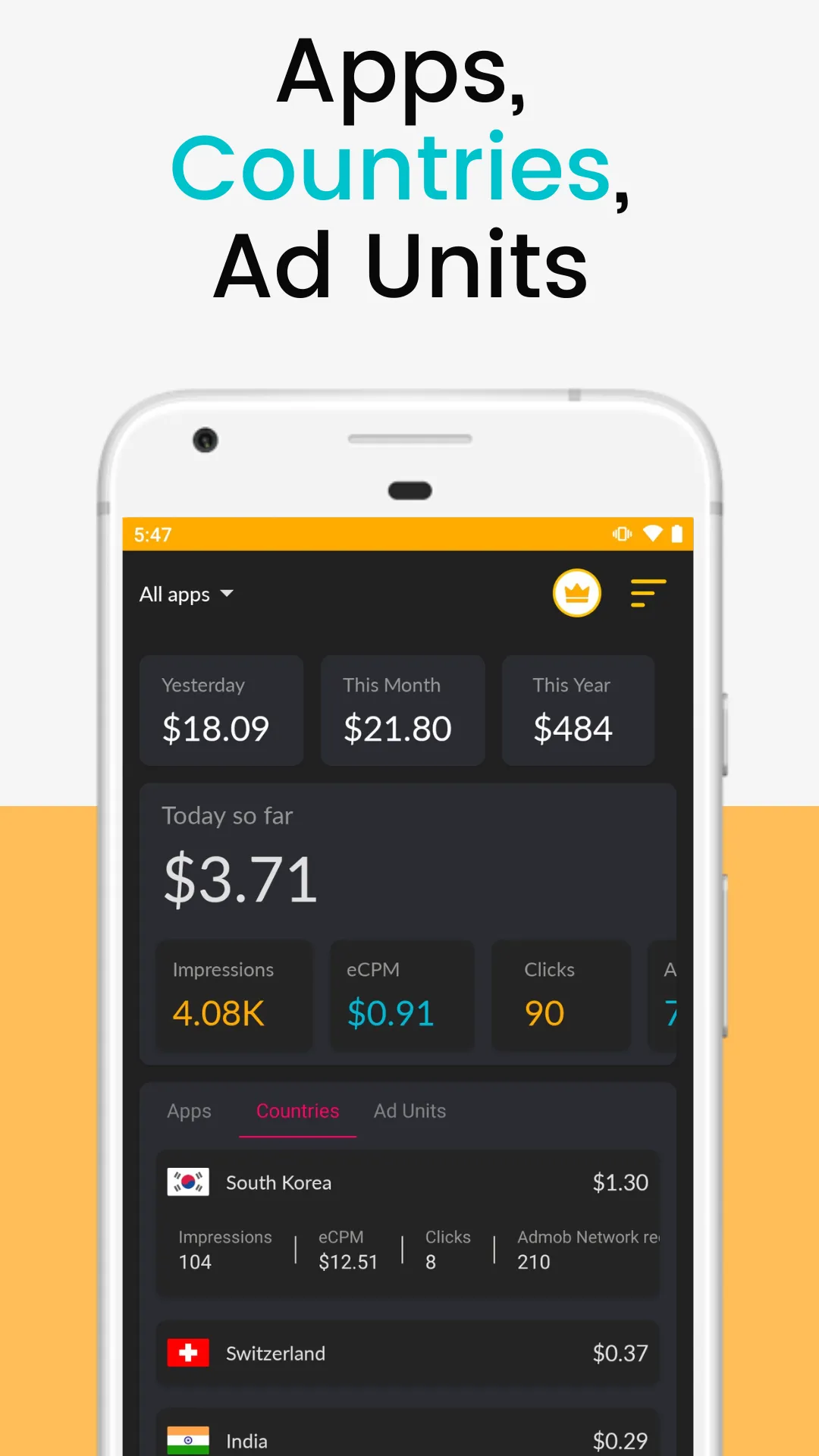 Experience the ultimate solution for responsibly managing app earnings with Dash. Developed exclusively for app creators, Dash for ads revenue empowers you to maximize revenue through compliant practices. We understand the importance of monitoring earnings and staying informed while adhering to proper standards. Dash offers: Transparent Earnings Insights : Gain a comprehensive view of your app's earnings, impressions, eCPM, ad requests, and match rate for today, yesterday, this month, and this year—all at a glance. Understand your ad revenue distribution across apps with ease....