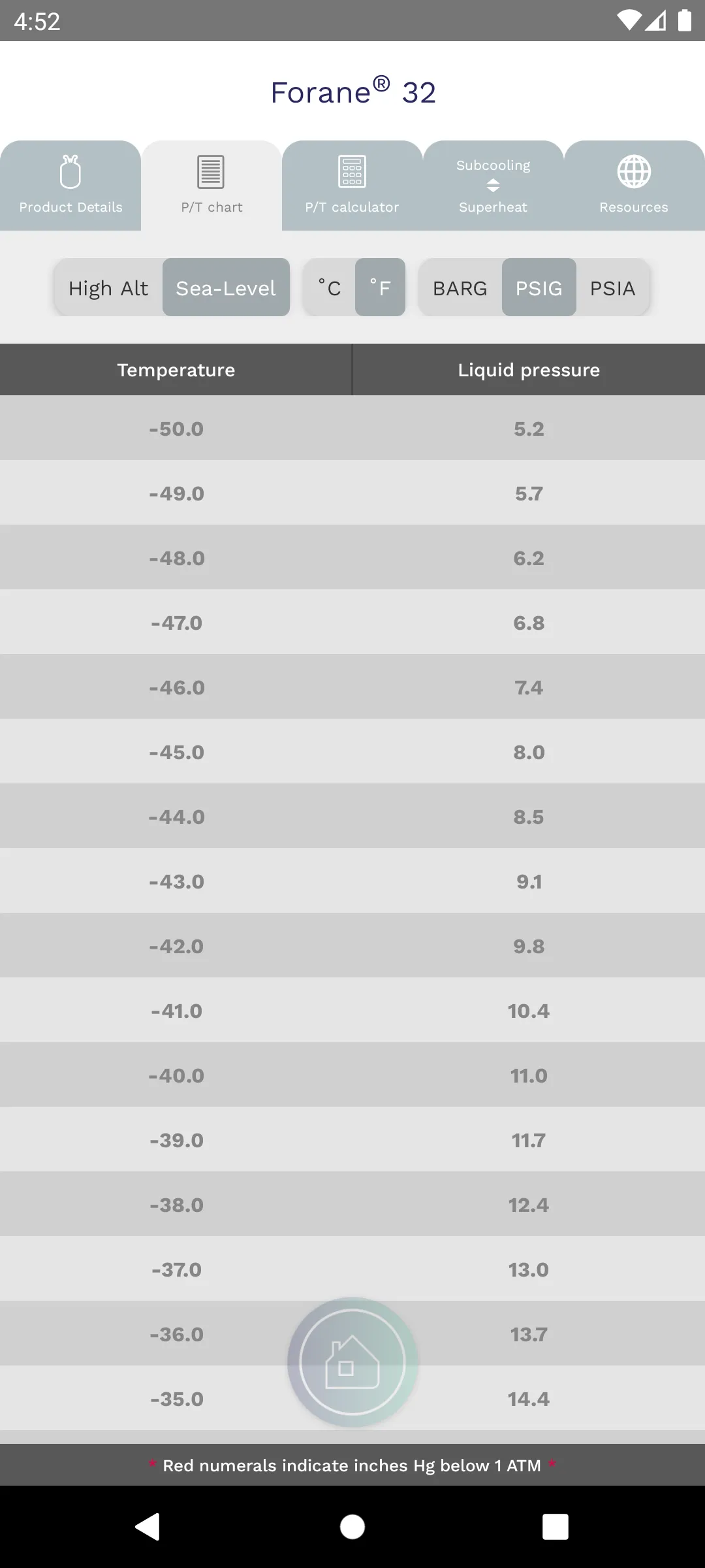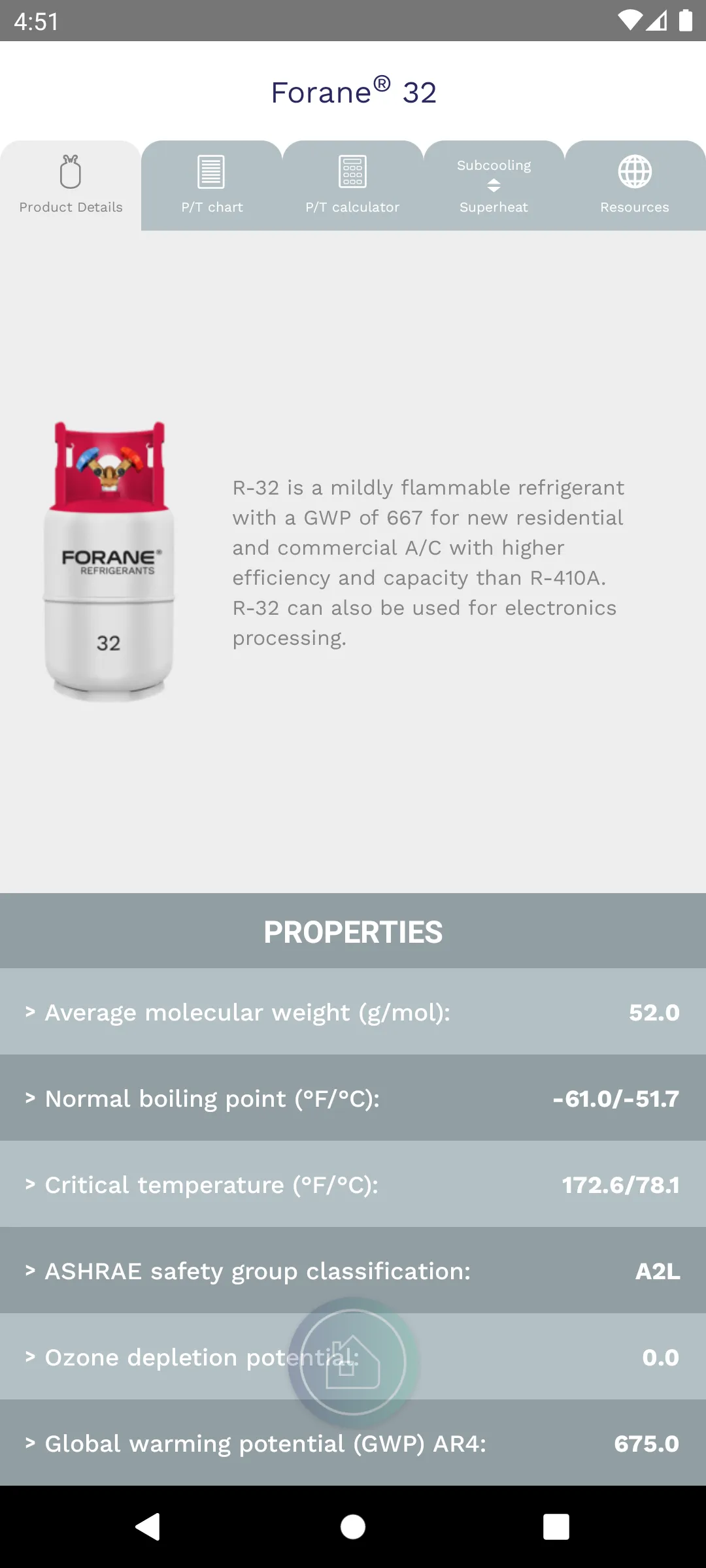 The Forane® Refrigerant Tool Belt® chart and calculator app is an essential aid for busy refrigeration and AC professionals working in the HVACR field. Forane® Refrigerant Tool Belt® provides electronic cross-unit PT charts for each refrigerant and enables users to easily input pressure or temperature readings and immediately receive all corresponding values in return. The app also provides quick calculation for subcooling and superheat values, as well as helpful descriptions and chemical properties of available Forane® brand and generic refrigerants. Use Forane® Refrigerant Tool Belt® to: - Review pressure temperature (PT) charts on-the-go - Input liquid pressure or temperature readings to receive corresponding values...