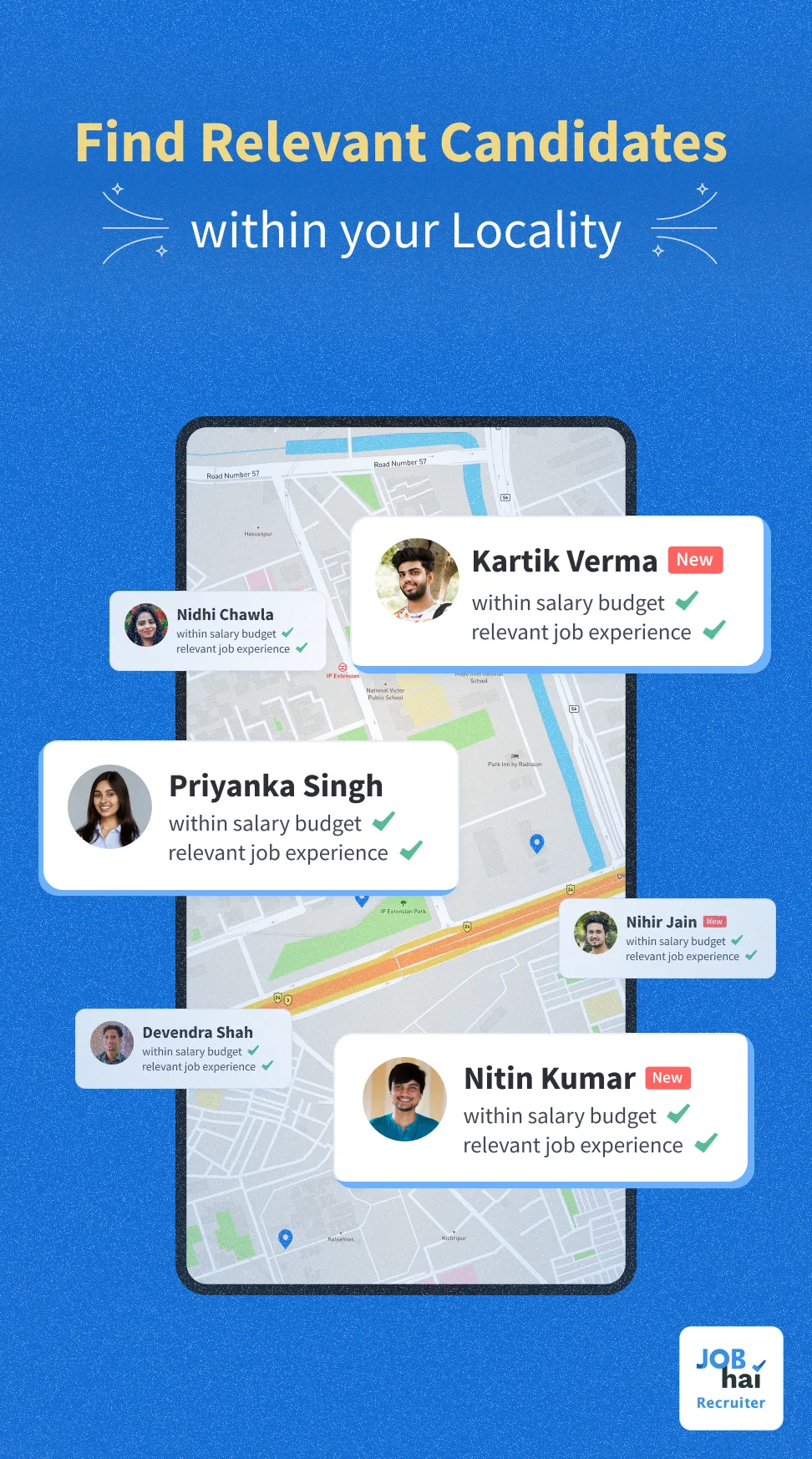 Start Hiring in less than 48 Hours! Job Hai Recruiter app is now live in 420 cities for your hiring needs. Recruiter/Employer/Comapnies can recruit candidates/staffs/employees for 45+ job roles in 420 cities in less than 48 hours! Post a job within seconds and get contacted by relevant, quality candidates from nearby areas in no time. Be it a job opening for a Customer Care, Telesales, Data Entry Operator, Back-office, Receptionist, Accountant, Teacher, Marketing, Sales, Business Development, Cashier and Recruiter-HR. Job Hai Recruiter will meet all your hiring or recruitment needs. Your job posting is shown to the most relevant candidates that fit your requirements. Within hours you will have candidates who are ready to give interviews and for immediate hiring. An easy way to post a job where you can mention your preferred candidate's location, education and relevant experience along with the flexibility to take walk-ins. Get candidate recommendations in no time and get in touch with them over the call or by dropping a free message. Job Hai has a rich database of both freshers & experienced/skilled candidates who are seriously looking for a job. Job Hai is the best Recruiter App that provides you with verified Candidates in the following cities: ...