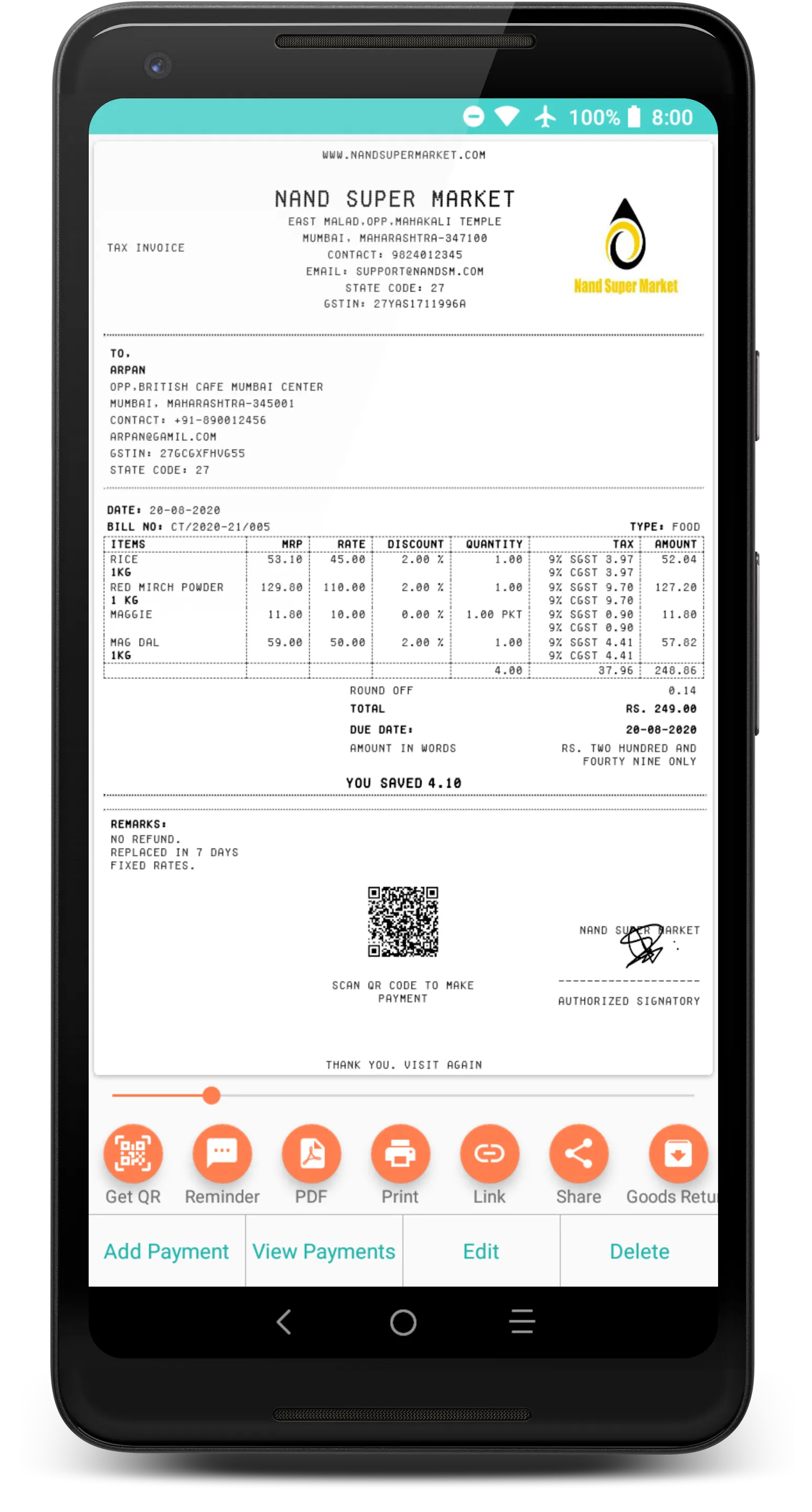 • Sync Invoices between Desktop and Mobile • Create Invoices and Track Payments. • Complete Invoice customization to suit any business or profession. • Share Online Invoice Links Instantly through SMS/Email. • Print to Wifi Printer. Generate PDF of Invoice from mobile. • Print invoice on thermal printer over bluetooth....