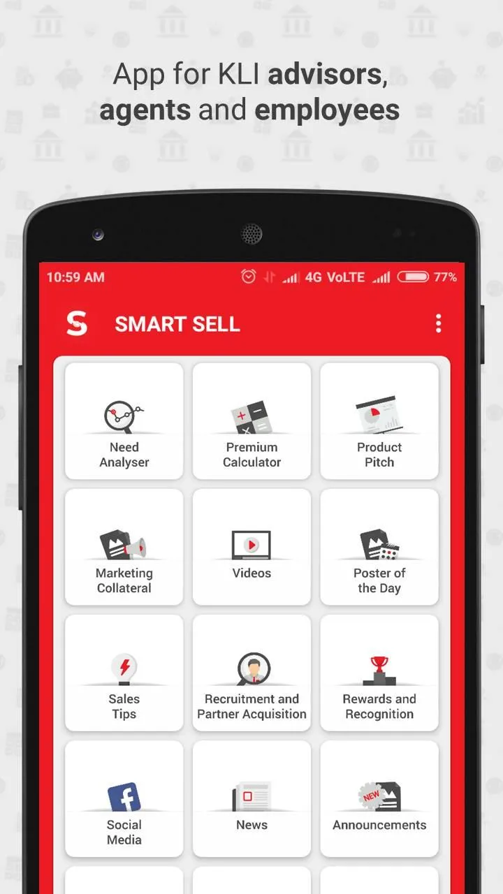 SmartSell equips KLI's advisers, agents, and employees, with the information, tools, and collateral to sell more. Features include: 1. Need Analyser to match needs with customers and give the people what they want 2. Product Pitch to make full-fledged, customized plan presentations, on the fly 3. World class marketing collateral which you can send out with the customer’s name on it...