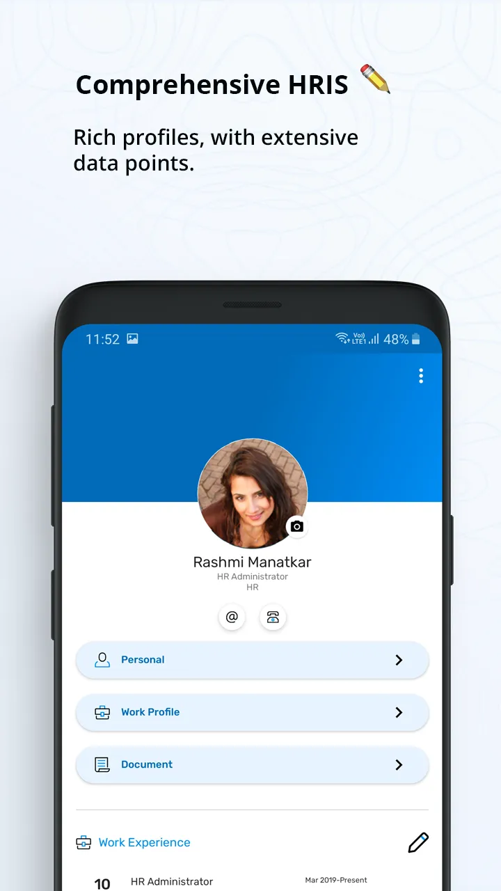 Comprehensive HRIS 📝 Rich profiles, with extensive data points. Directory 📒 Quick access to all the wonderful people you work with. Ask or Approve ✅ Manage all HR requests from one central place. GPS Attendance 🌍 Be boundless. Go where your work takes you. Geo Tracking 📍 See where you've worked, and tell others where you've been. Claim expenses 💳 Settle your expenditures, on-the-go. HR Drive 💾 Secure and robust, built-in storage for all things HR.