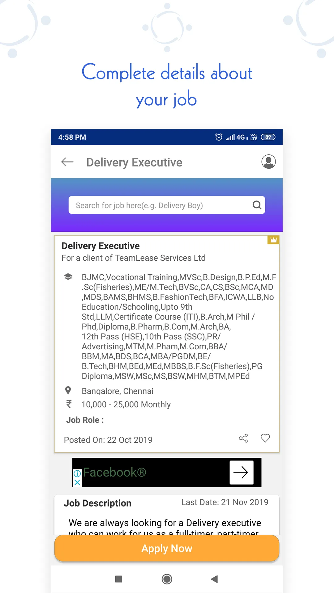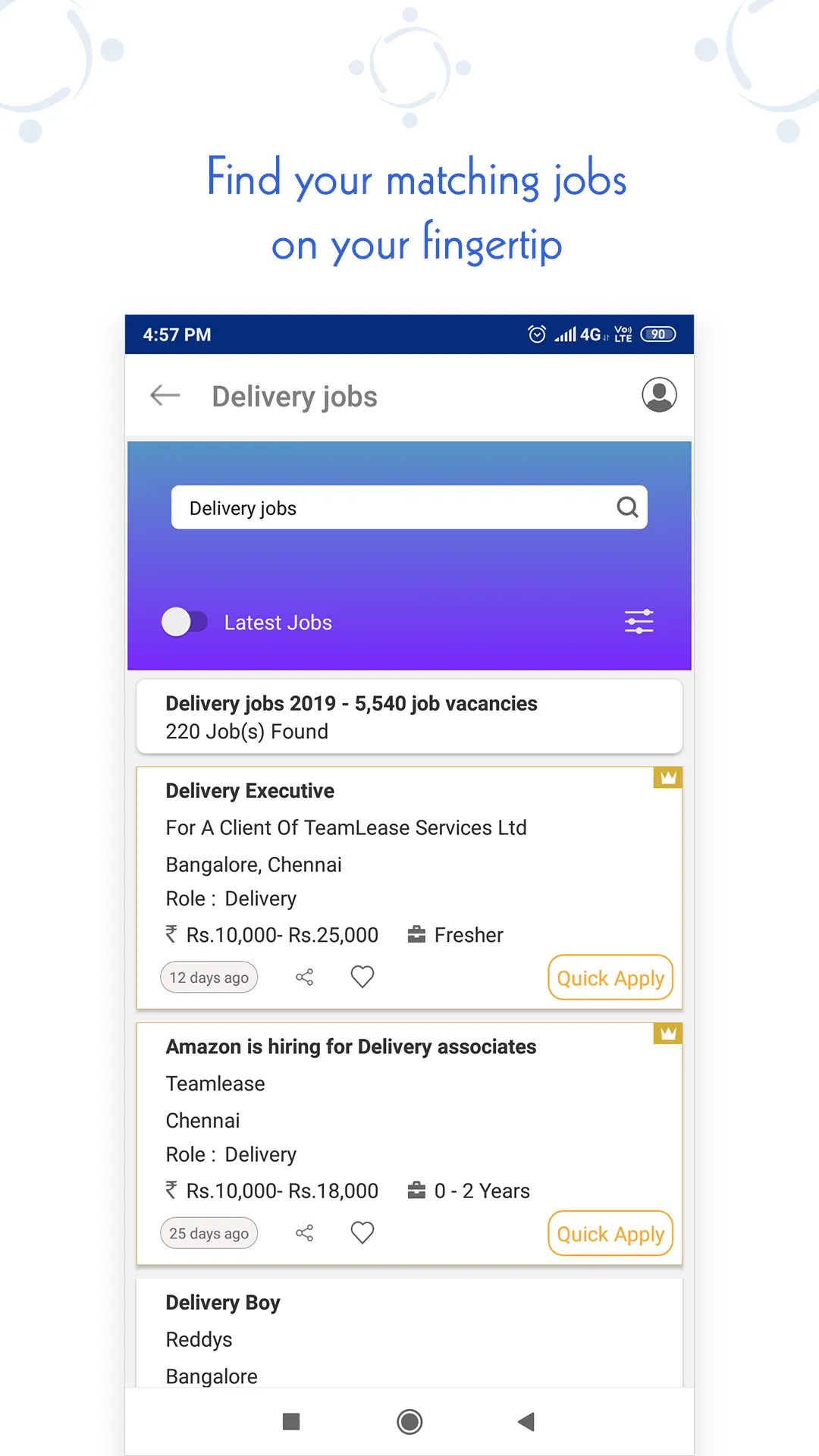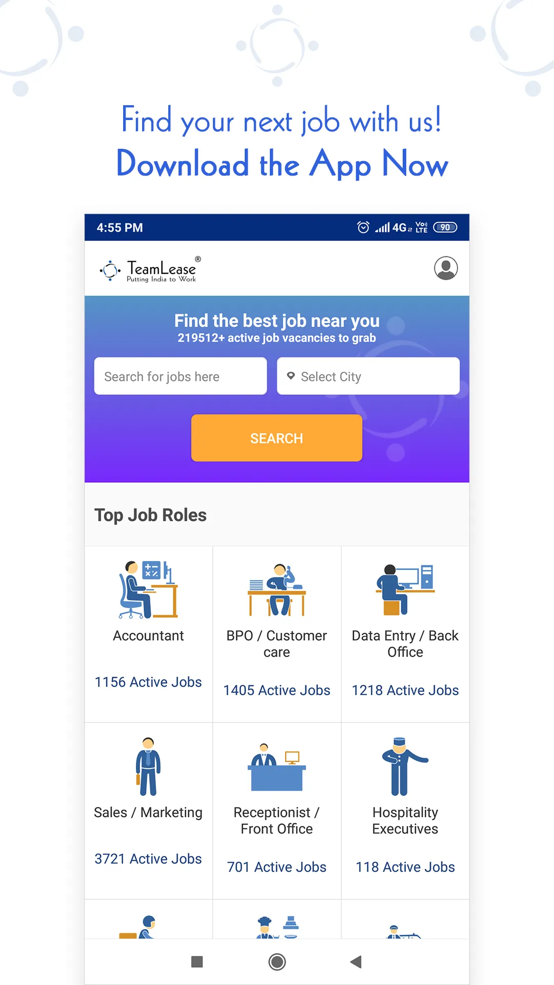 Looking for a driver, delivery, carpenter, painter, Cook Chef, Nurse, Maid or any skilled jobs then TeamLease is the place where you will get all the jobs. TeamLease job search app is the one stop solution for all Entry level, Skilled and Blue collar employees. Indeed job searching for entry level and blue collar candidates become so easy, transparent and efficient via TeamLease. Download or Install our advanced “TeamLease job Search App” & make your job search in the right path. Why TeamLease jobs Search App Register FREE on TeamLease. Do Job search in simplified to your preferred languages We are the 1st job portal/website in India that enables you to opt for any Indian languages, such as Hindi, Kannada, Malayalam, Tamil, Bengali, Telugu apart from English, depending on your preference....