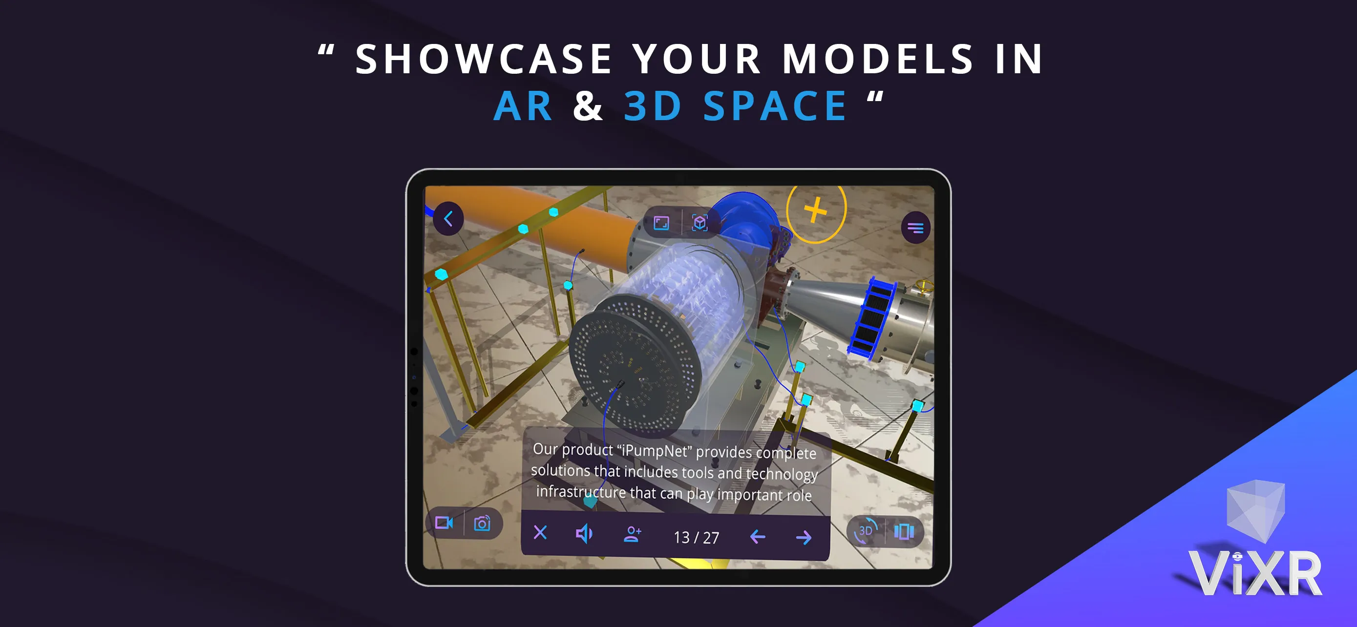 Advanced 3D product presentations brought to life! With ViXR Wonder, bring your product catalog to life, with our cutting edge Augmented reality platform, designed for professional and personal use. ViXR Wonder creates a private AR presentation for you and your clients, where you can showcase your products and services. Simply initiate a meeting from within the application, and present your product to your clients on the go. ...
