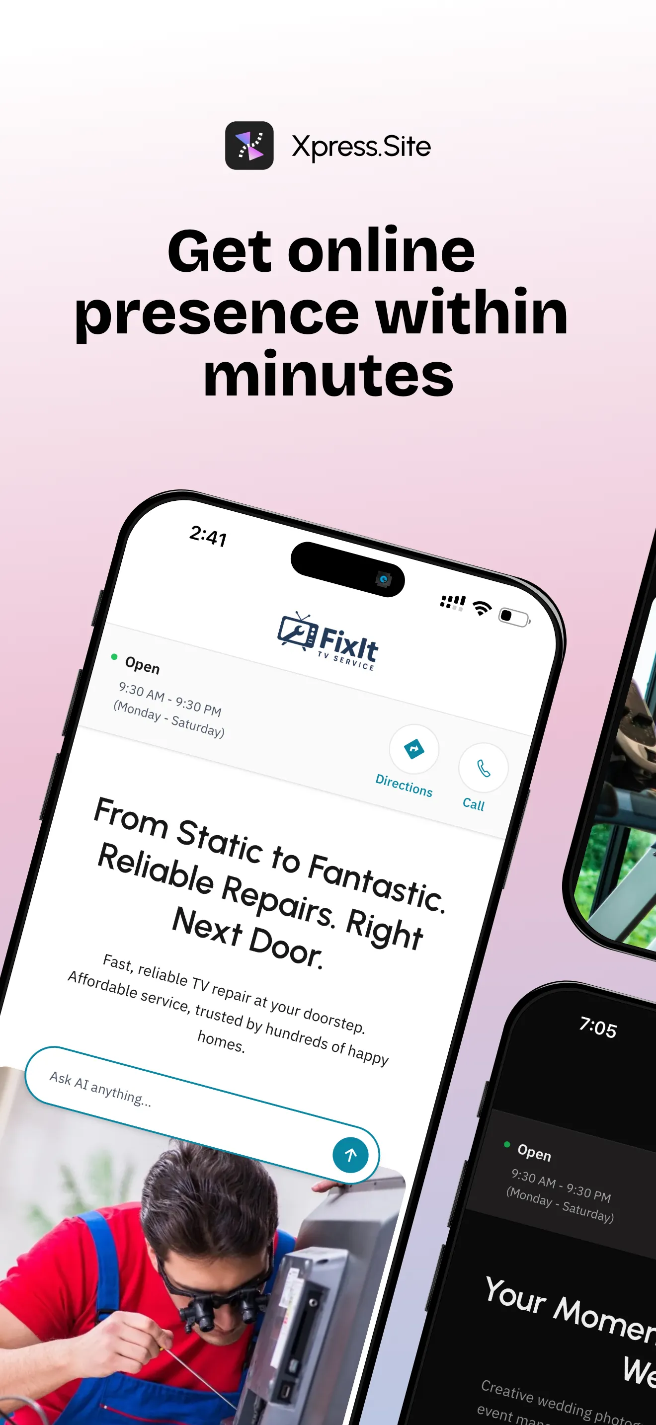 Xpress Site is the fastest way for local businesses to build a professional website — straight from your phone. Whether you run a gym, salon, clinic, or repair service, you can launch your online presence in minutes and start capturing new customers. Key Features: #1 Get online fast: Launch your website in minutes with pre-designed templates....