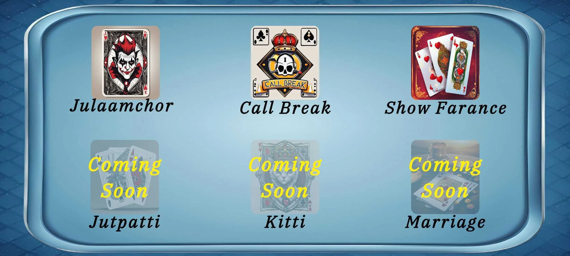 "Taas," a captivating single-player card game collection that brings together three beloved card games: Julaamchoor, Show Fanance, and Call Break. Each game within "Taas" offers its own unique set of rules and strategies, ensuring a varied and exciting gaming experience every time you play. In Julaamchoor, challenge yourself to outsmart the computer in a game that demands both skill and strategy. Analyze your hand, make strategic decisions, and try to capture the cards you need to win. Twist "The Joker Card" is not jack but a random card show your skills to find out the "Mystery Card" and win the game. Show Fanance offers a different kind of thrill, focusing on quick thinking and sharp reflexes. It's a game where every move counts, and your ability to read the game and adapt to changing situations will be put to the test. ...