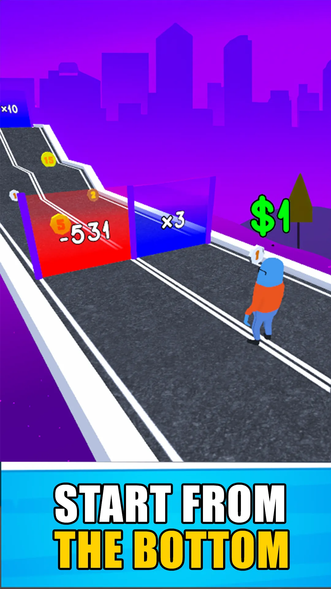 Cash Road is an exciting 3D running simulator with choose gate gameplay. This free run game draws inspiration from the world of making money, offering you a simulated journey towards becoming a millionaire or even a billionaire. Run to the right gate and win levels - avoid obstacles to earn more cash and rewards. Undoubtedly, it stands among the top 3D running games of 2023 that you simply cannot afford to miss. Embark on your adventure as a character without a wealthy background but armed with ambition. Your primary mission is to earn money, learn valuable skills, and work your way up to riches. It's crucial to avoid distractions along the way, such as negative gates and other obstacles as they can lead to financial ruin. Keep your focus on making money! However, transforming from poverty to wealth doesn't happen overnight. Before reaching the billionaire status, you'll go through phases of being homeless, a worker, a banker, a successful businessman. As your earnings increase, your appearance will also evolve accordingly. Your ability to monetize and hold onto your wealth will determine the level of comfort and assets you acquire. Becoming a millionaire means enjoying the life of your dreams and reigning as a true fashion icon and perfect dancer....