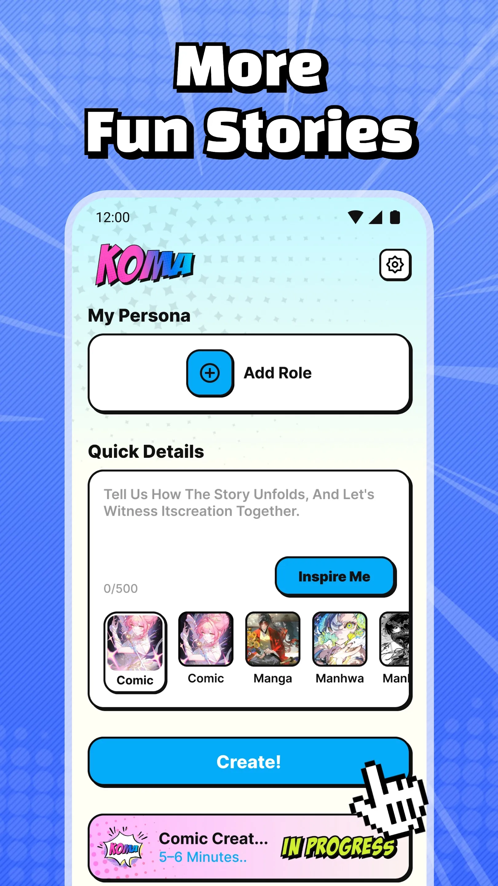 Koma: You Are the Visionary of Your Own Universe With Koma’s AI engine, you sit in the director’s chair. Effortlessly breathe life into your narrative by uploading photos to cast custom characters, refining their details, and watching them evolve into stunning manga, manhwa, or webtoon avatars. Whether you are visualizing a fan-fiction passion project or birthing a completely original saga, the power is in your hands. A Spectrum of Genres, Tailored to You Weave narratives across every spectrum: from adrenaline-fueled shonen and isekai to delicate shoujo, gritty mecha, sci-fi, fantasy, romance, rom-com, leveling systems, slice of life, superhero epics, indie graphic novels, and beyond....