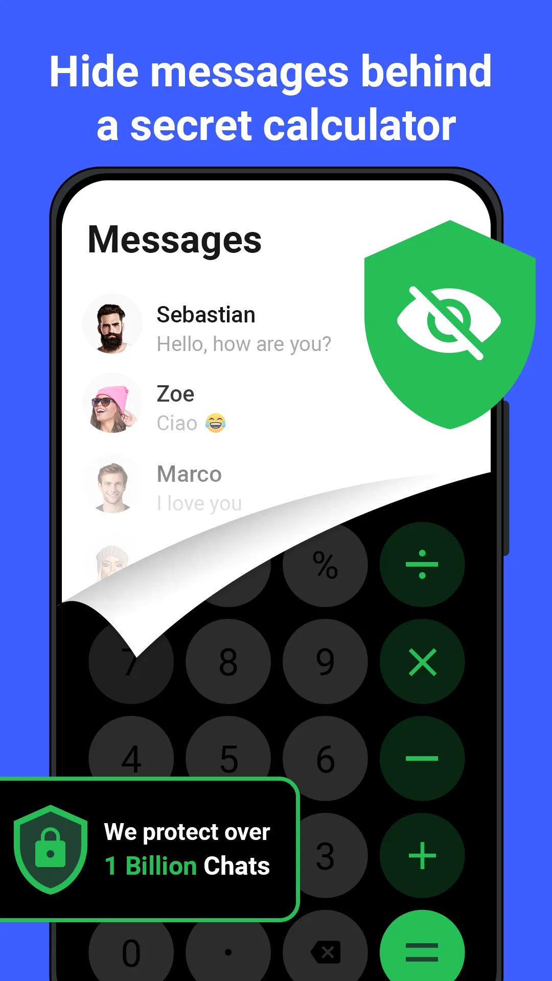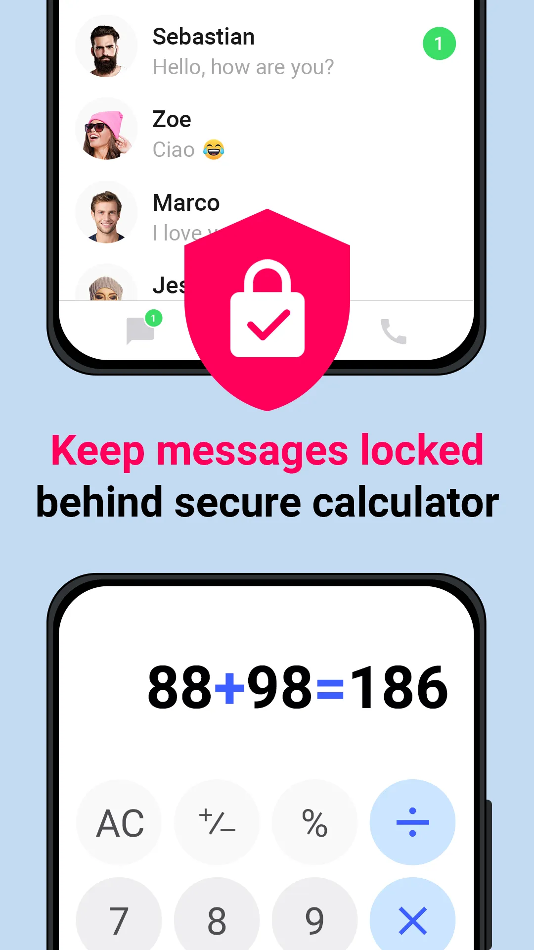 The Messenger Calculator private text messaging app has a number of secure features to keep your messages private. Messenger Calculator is the most secure texting app for your private messages. Hide text messages behind a secret calculator wall. Messenger Calculator is your new private texting app to send sms and free messages over wifi or data looks like a calculator app. Text messaging app Messenger Calculator has the app icon and name Calculator. Snoopers only see the calculator app on your phone and your messages are safe. Messenger Calculator has secret notifications about incoming messages. Messenger Calculator has secret notifications for incoming messages. Secret notification does not show the message and the name of the sender. Unlock your personal realm of confidential communication by entering the correct secret code, revealing your hidden text messages seamlessly integrated within the calculator interface. Say goodbye to prying eyes and nosy individuals – your private conversations are now concealed behind a secure and inconspicuous façade. Elevate your messaging experience and take control of your privacy today!" In today's digital age, safeguarding your personal conversations has never been more crucial. Our Text Messaging App offers a vital layer of protection, allowing you to hide messages and maintain privacy. With increasing concerns about data breaches, identity theft, and unauthorized access, our app ensures that your sensitive discussions remain concealed from prying eyes. Whether discussing confidential matters, sharing personal information, or simply valuing your right to privacy, our hidden messaging feature guarantees that your conversations are shielded behind an impenetrable calculator wall. Take control of your messages and prioritize your privacy with our secure communication solution." Hide text messages and protect your privacy. Messenger Calculator text messaging app is privacy messaging for all who can keep text messages private. The texting application for hiding and sending text messages is necessary for everyone who has a jealous partner and wants to protect their privacy. No one will know about your secret conversation. ...