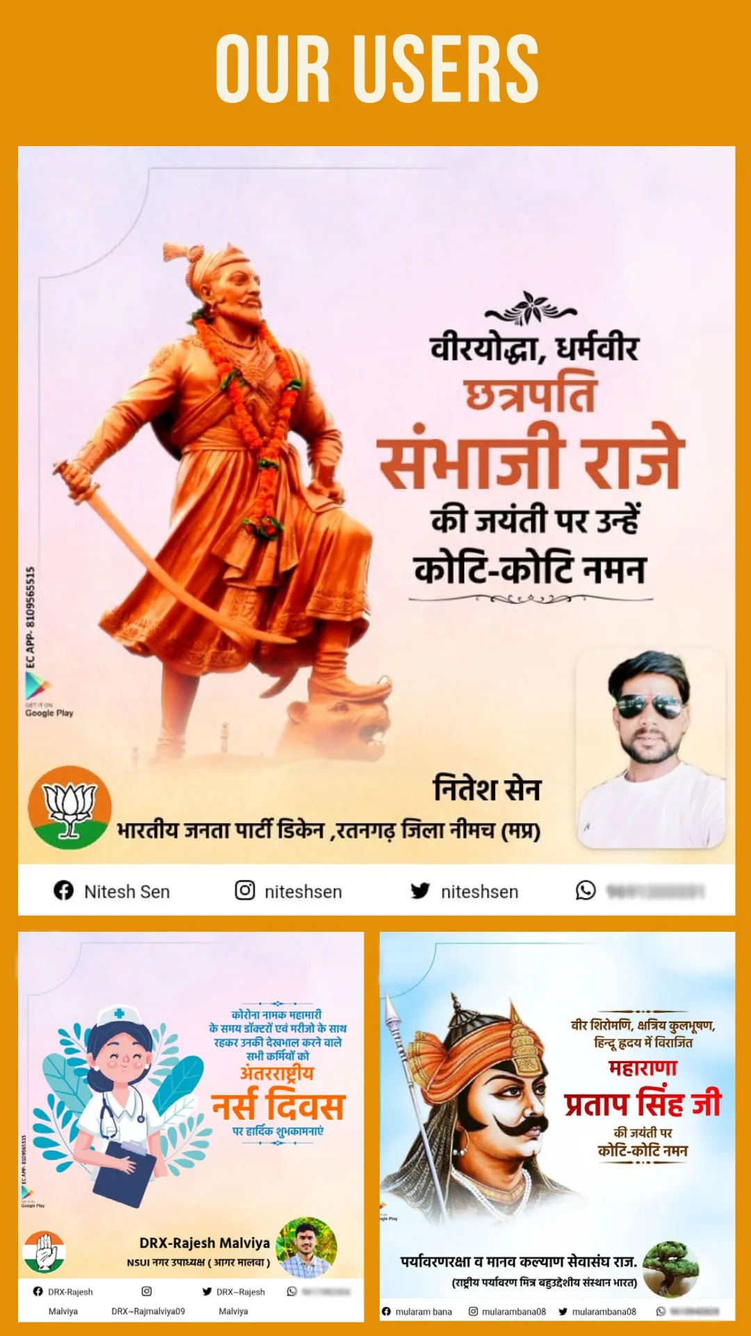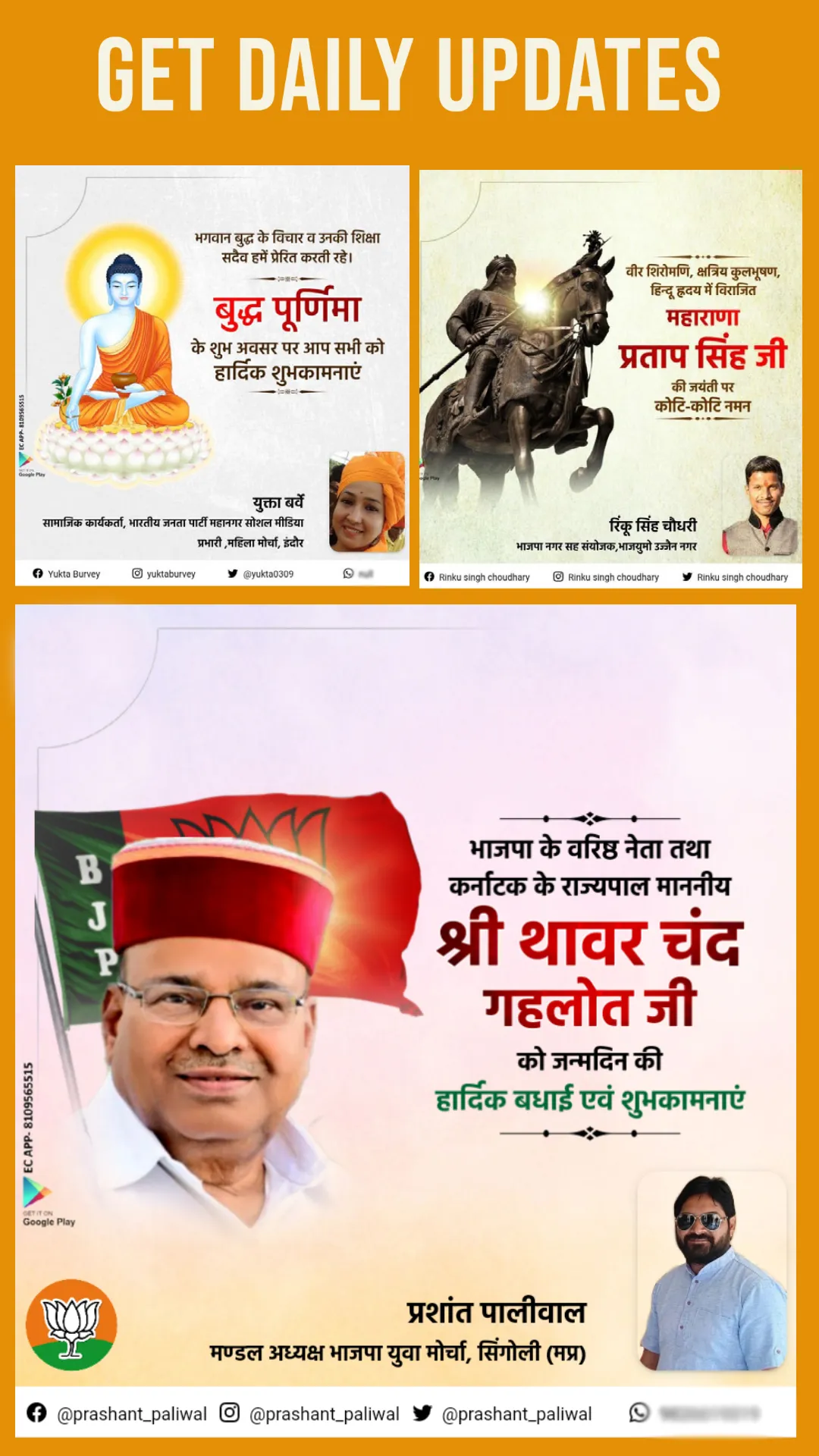 Daily Political news, Festival, Event and Quote Post for Social Media (1) Online Political Poster and Frame maker with your photo: You will get daily post and content related to all the parties. You can personalize it with your photo, name and designation. You can also add your party logo. You will get all parties like bjp congress posters and political frame. You also get banner maker photo and text in hindi. Get bjp post, congress post. (2) Festival Post: You will get daily festival poster with multiple designs (3) Daily Event Post for Free: It will keep you up to date with the daily events (4) Quote Post: You will get daily quote/suvichar. You can also desgin suvichar...