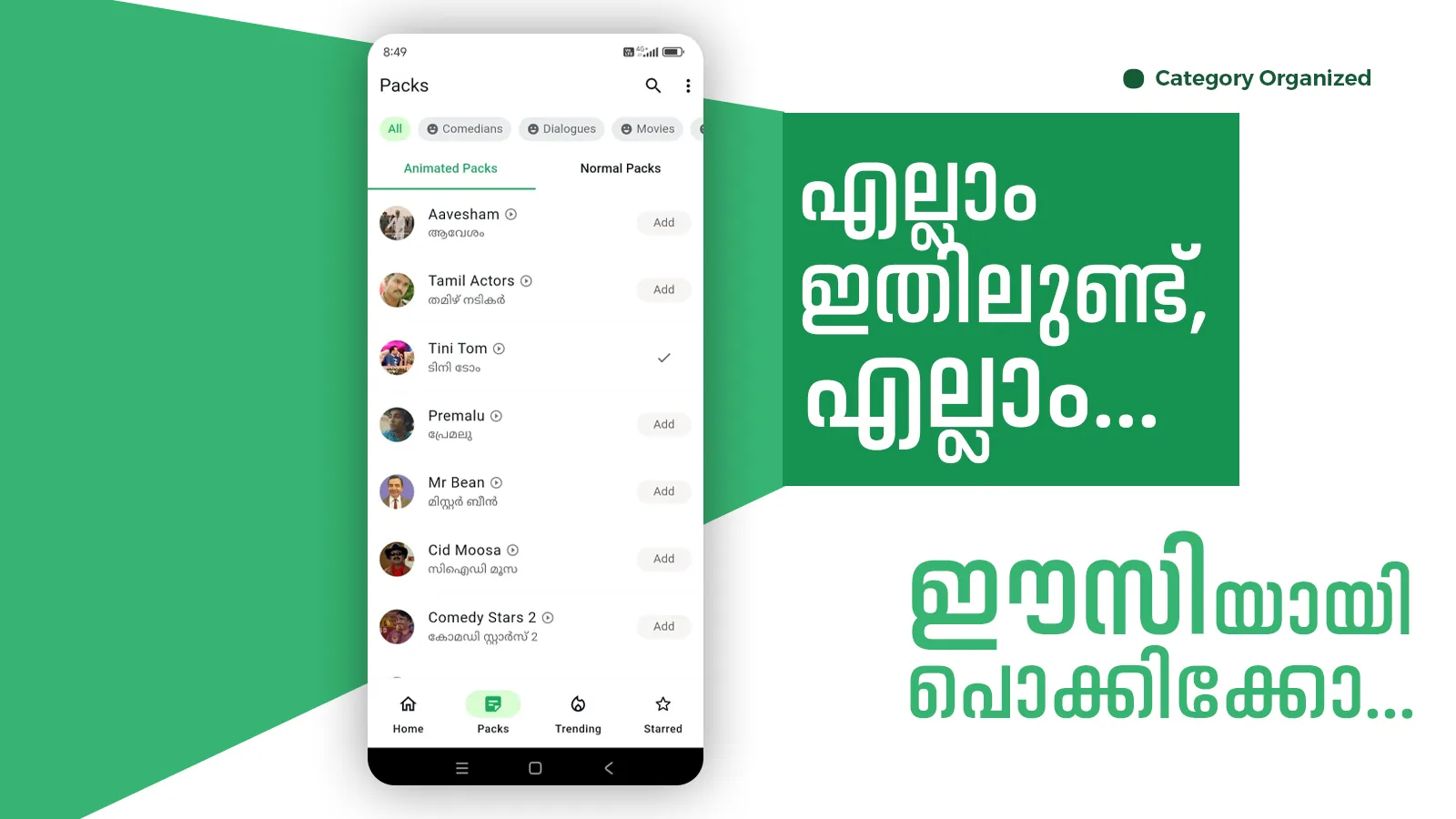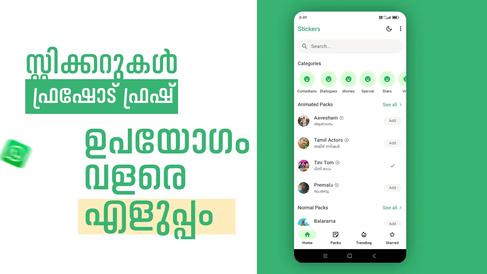 Introducing the Malayalam WhatsApp Stickers app, featuring a unique collection of troll memes and punch dialogues that will add humor and express your emotions perfectly in your conversations. With a sleek and modern design, the app is user-friendly and easy to navigate. You'll love the seamless browsing experience and how effortlessly you can find the perfect sticker for any occasion. Plus, we're constantly updating the app with fresh content, so you'll always have access to the latest animated stickers (GIF). Whether you're a fan of Malayalam cinema or simply looking to spice up your WhatsApp chats, this app is a must-have. Download now and join the fun with your favorite movie stars! ...