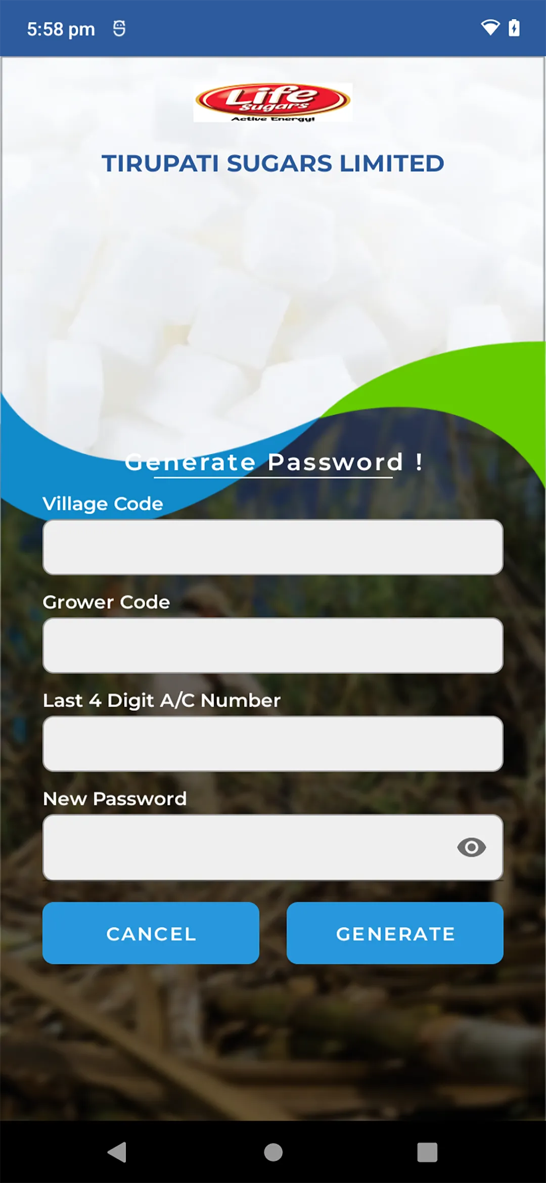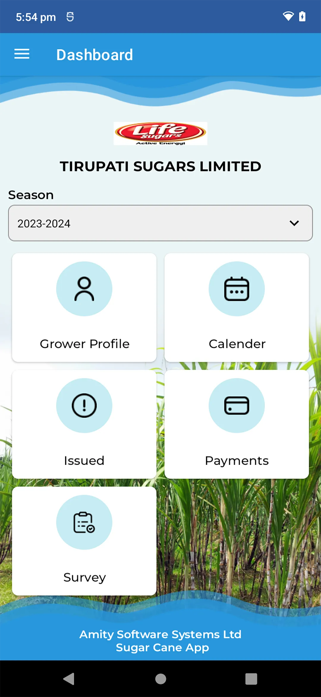 The Tirupati Sugars Kisaan app is designed for the Tirupati Sugars Mill. All registered farmers of this sugar mill can view current and previous year information related to the sugarcane survey, calendaring, indenting, and payment details using their village and grower code along with their password. In the case of supervisor login, they can view sugar mill crushing details, along with farmer's sugarcane survey, calendaring, indenting, and payment details using the village and grower code. Supe...