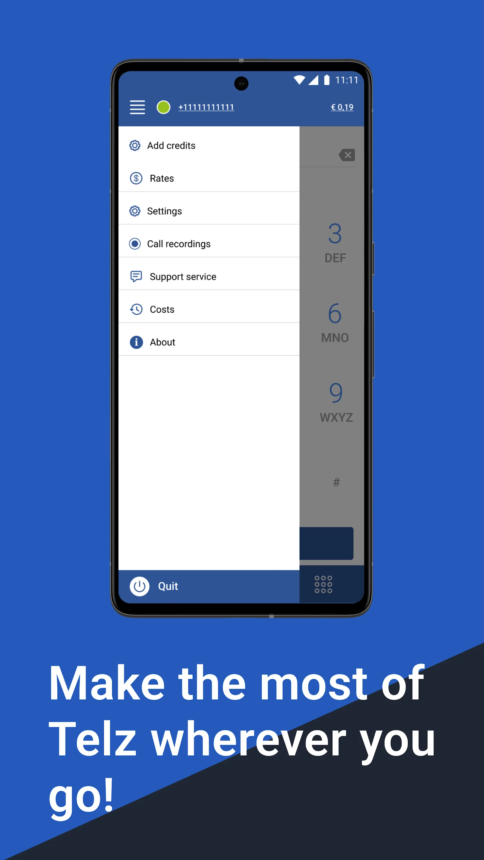Make a call to any country, to any city, to any phone with international direct dialing! You can also record the conversation and save it for future use. Nobody will know that you are calling through Telz. The savings on calls will be a good surprise for you....