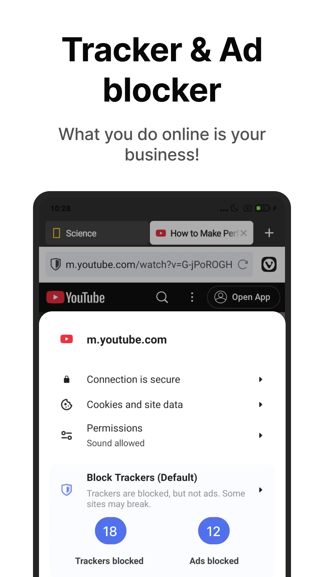 We’re building a fast, ultra customizable browser that prioritizes your privacy (not our own profit). An Internet browser that adapts to you, not the other way around. Vivaldi browser comes packed with smart features including desktop-style tabs, a built-in Ad Blocker, protection against trackers, and a private translator. Browser options like themes and layout choices help you make Vivaldi your own. Personalized Speed Dial Browse faster by adding your favorite bookmarks as Speed Dials on the new tab page, to keep them one tap away. Sort them into folders, pick from a bunch of layout options, and make it your own. You can also switch Search Engines on the fly using Search Engine Nicknames while typing in Vivaldi’s Address Field (like ""d"" for DuckDuckGo or ""w"" for Wikipedia). ...