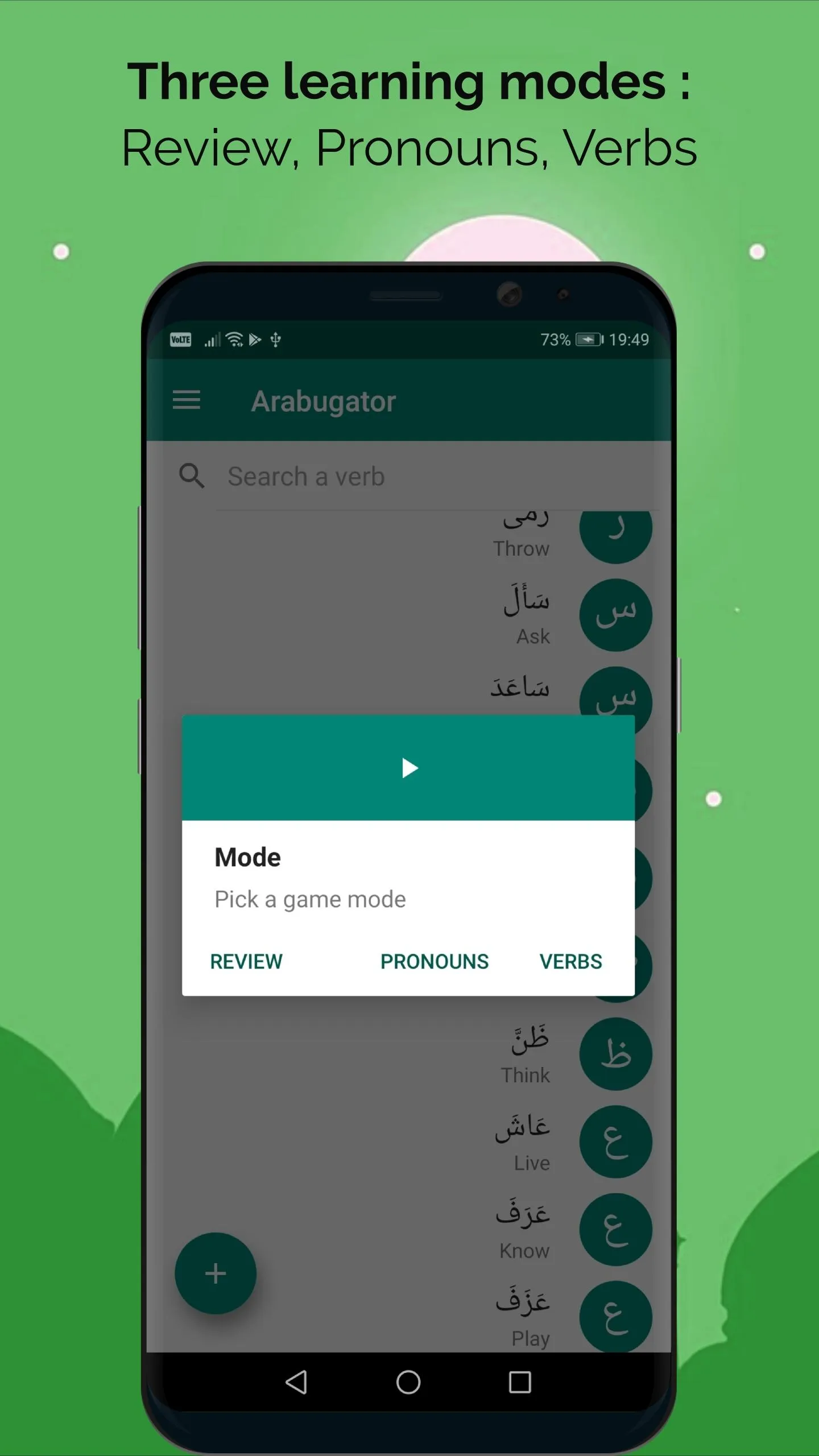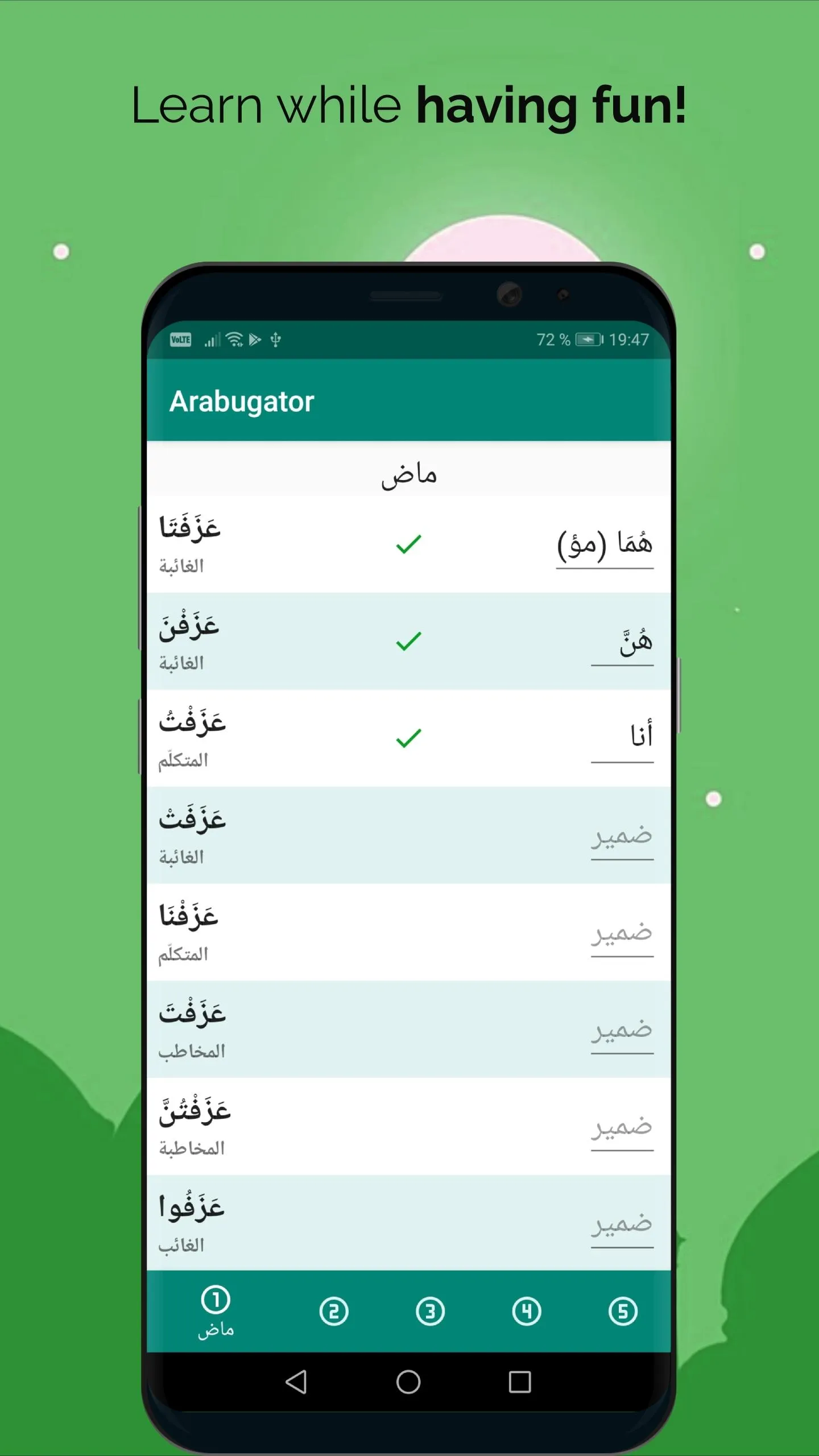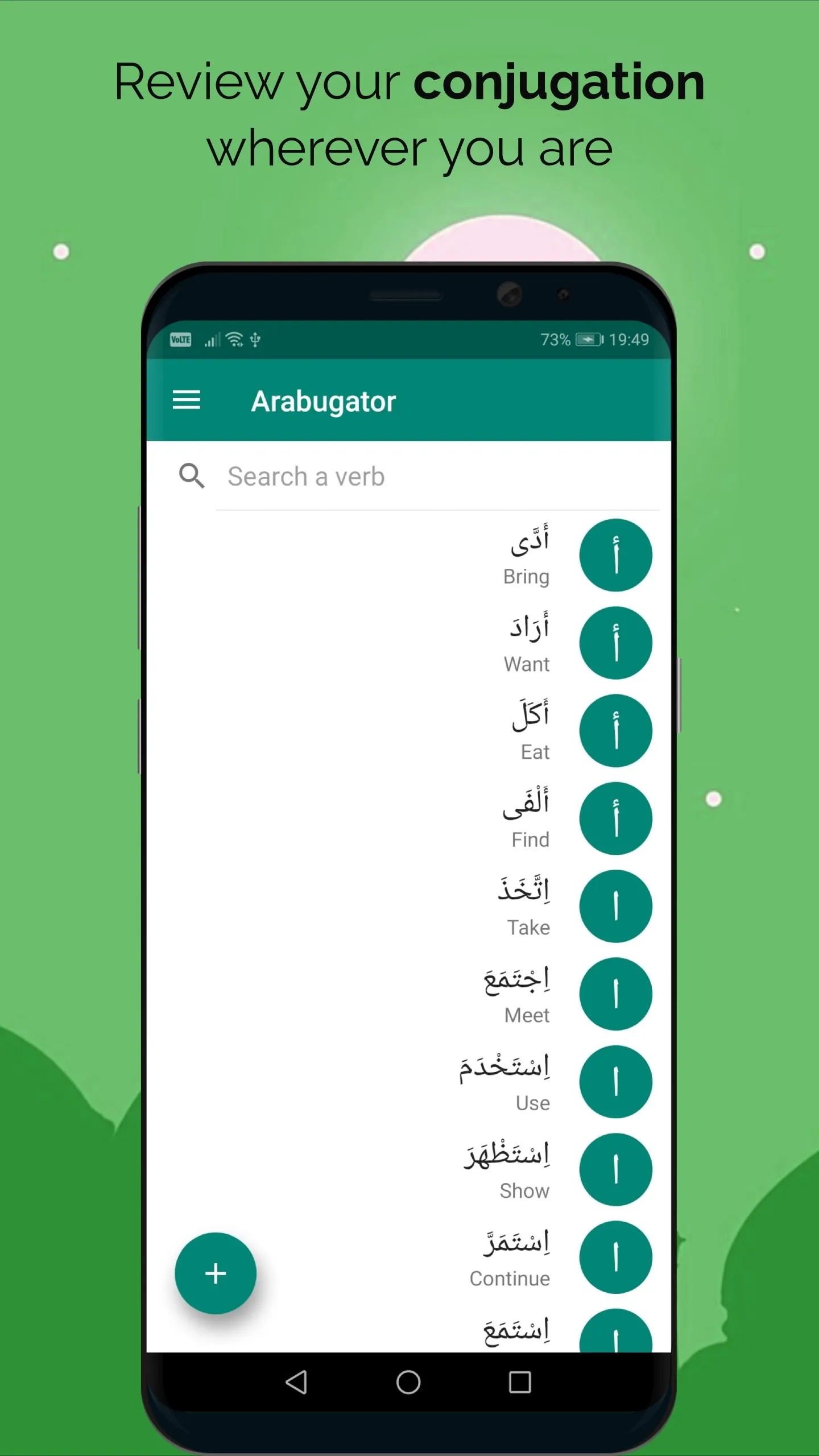 Arabugator is an application that allows you to consolidate your knowledge in Arabic conjugation. Arabugator offers you about a hundred verbs in Arabic, in three tenses, among the different existing forms. We offer 3 modes to help you in your arabic learning to consolidate your knowledge: - Review mode, to review the conjugation tables for each verb...