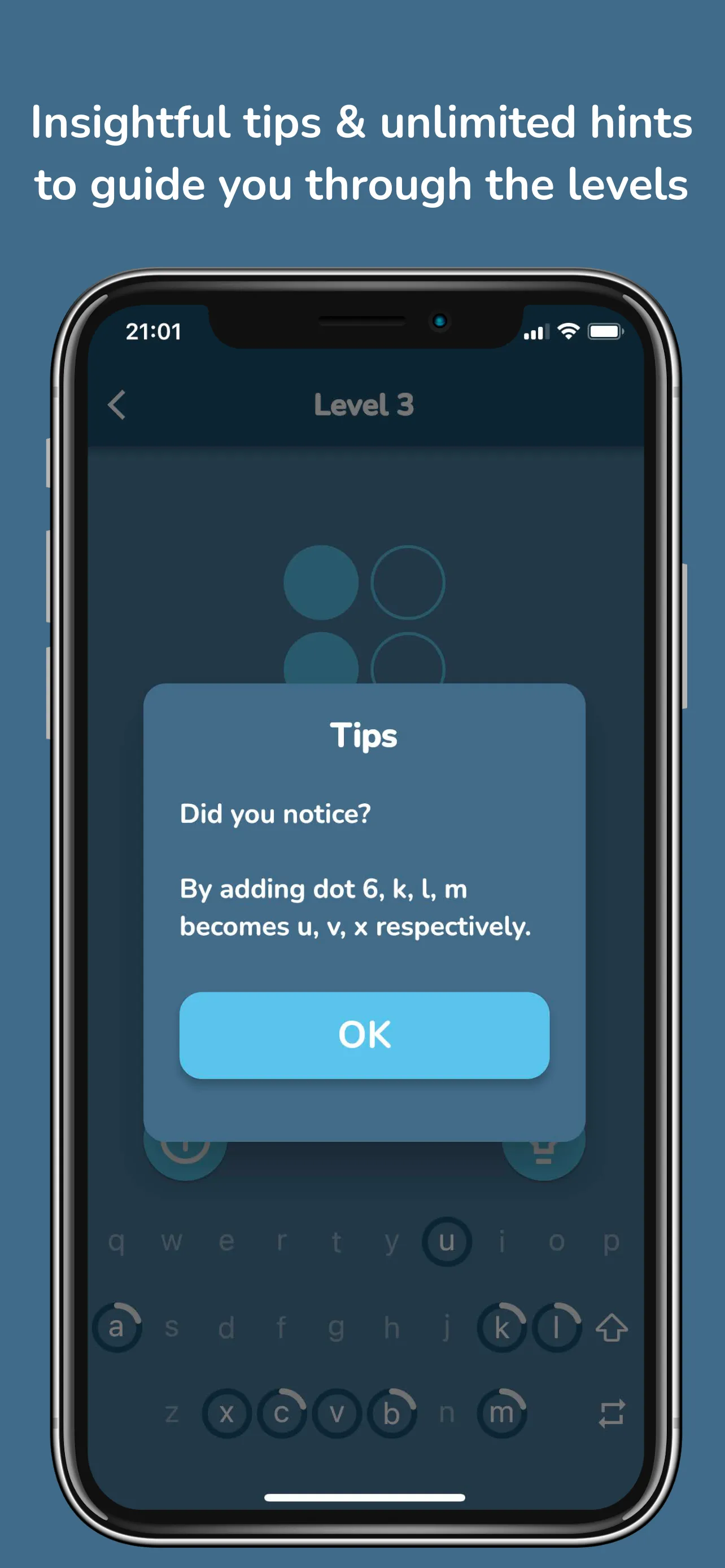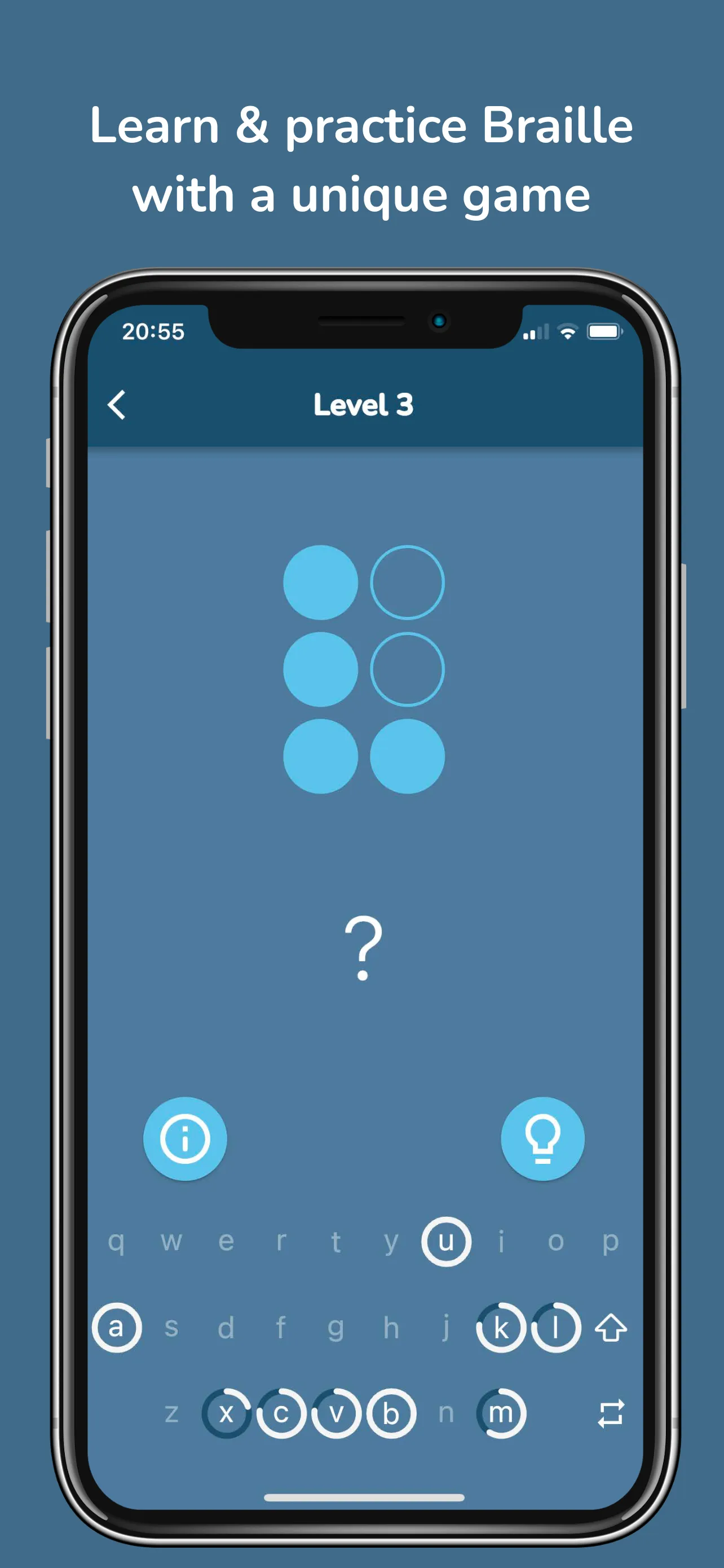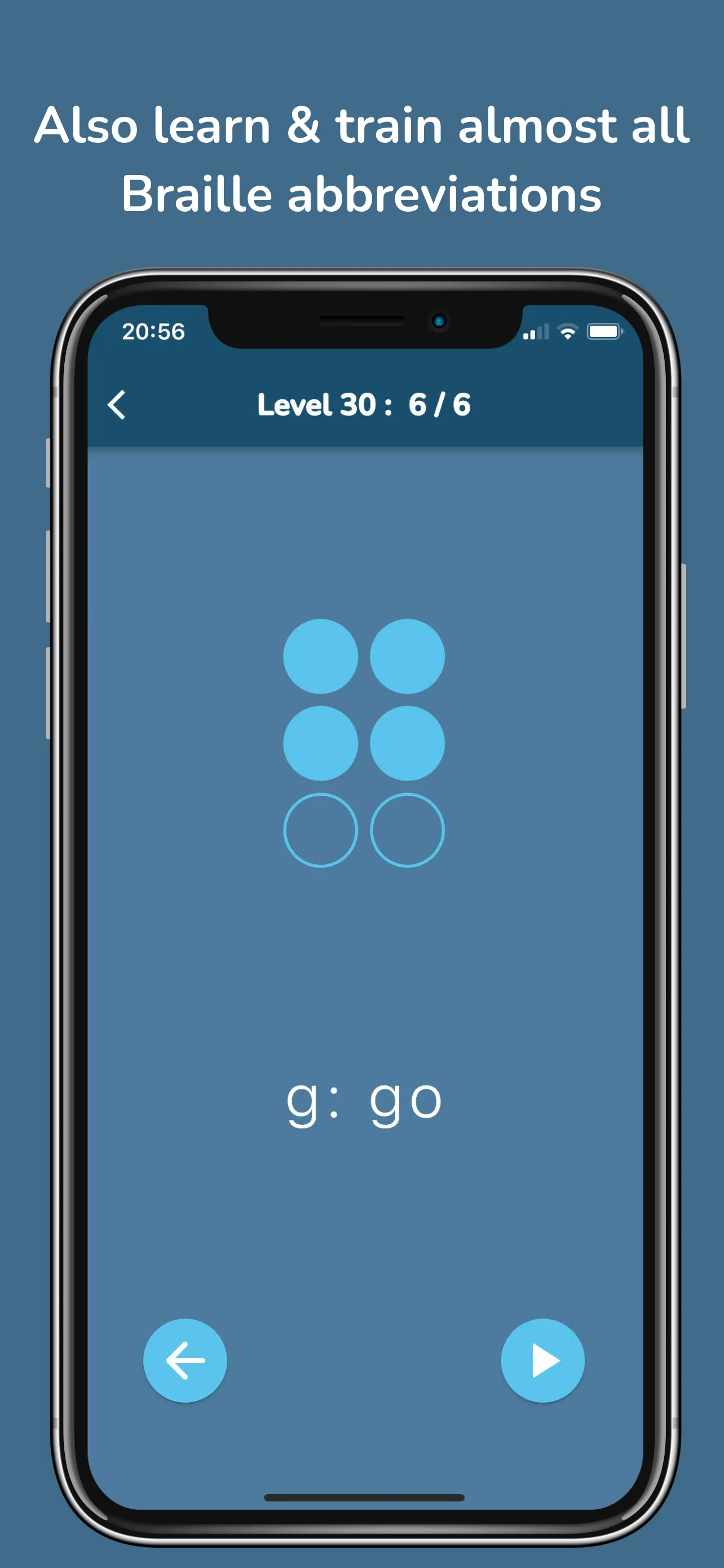Features: - 13 chapters, namely Letters, Numbers, Basic Punctuations, Special Symbols, Alphabetic Wordsigns, Strong Contractions, Strong Wordsigns, Strong Groupsigns, Lower Groupsigns, Lower Wordsigns, Initial Letter Contractions, Final Letter Groupsigns and Shortform Words. - Teaches strategically Unified English Braille (UEB) of all 26 letters of the English alphabet, numbers 0 - 9, 12 most frequently used punctuation marks, 8 most frequently used special symbols, 23 alphabetic wordsigns, 38 contractions, 12 wordsigns, 34 groupsigns and 75 short-form words. - 59 levels and 29 challenges in total to teach, train and test more than 90% of the entire Unified English Braille knowledge. - Various themes to choose from including the Contrast theme (more contrast and bolder text) for visually impaired. - Absolutely no distracting ads....