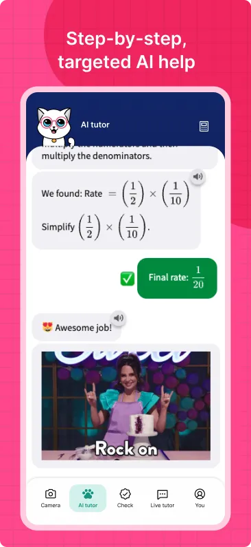 With Bytelearn’s AI and live math tutor help, learn for real and crush your math tests and the SAT & ACT! 💪 Unlike systems that just give homework answers 🙄, Bytelearn’s AI coaches you step-by-step 🐾 through solving and understanding your math problems. 🙌 😸Byte, the AI tutor + 🌅24/7 live professional tutors • Byte and our team of highly capable human tutors are always ready to help, whenever you need. Built atop OpenAI’s ChatGPT / GPT-4. ...