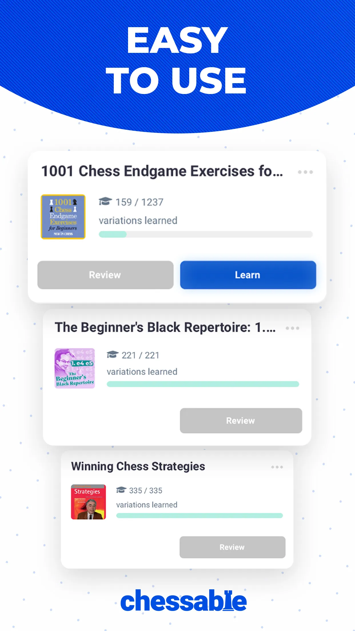 Learn Chess Online from the World's Best Players Chessable is the best way for beginners and experienced players to learn and train chess online. Learn chess with courses from the world's top players, including Magnus Carlsen, Fabiano Caruana, Anish Giri, Judit Polgar, and many more. Chessable uses the science of spaced repetition to help you remember what you learn and improve your chess skills over time. Learn chess basics, strategy, and tactics from chess masters and coaches. With hundreds of free chess courses to choose from, you can find the perfect course for your level and interests. From openings to endgames, Chessable has you covered. ...