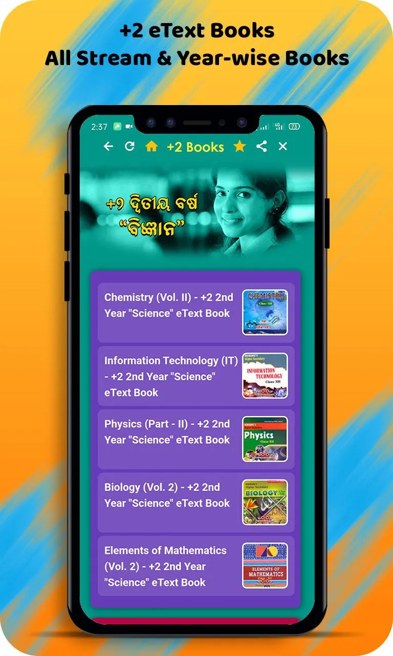 "+2 College Books (Odisha CHSE)" is an app by OdiaPortal Lab. This app is very effective and useful for students who are studying in +2 1st year as well as +2 2nd Year in Arts, Commerce, Science & Vocational Stream under CHSE Odisha or Odisha Higher Secondary Council. App Features: • Chapter/Unit wise PDFs that helps you to quick read anytime you want. • Arranged Stream and Language wise • Clearly Scanned Pages brings you sharp and clear text for reading....