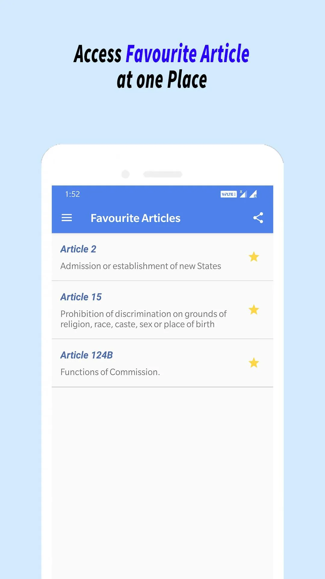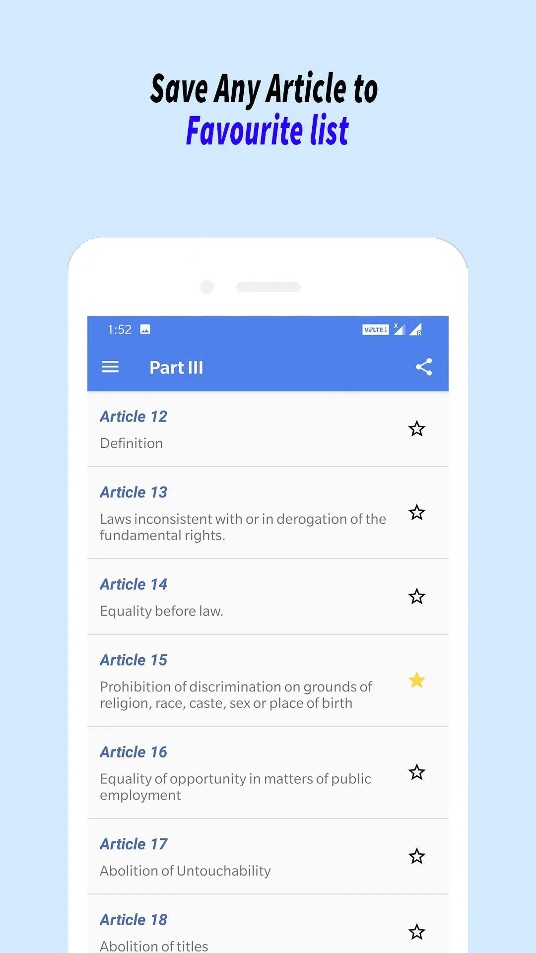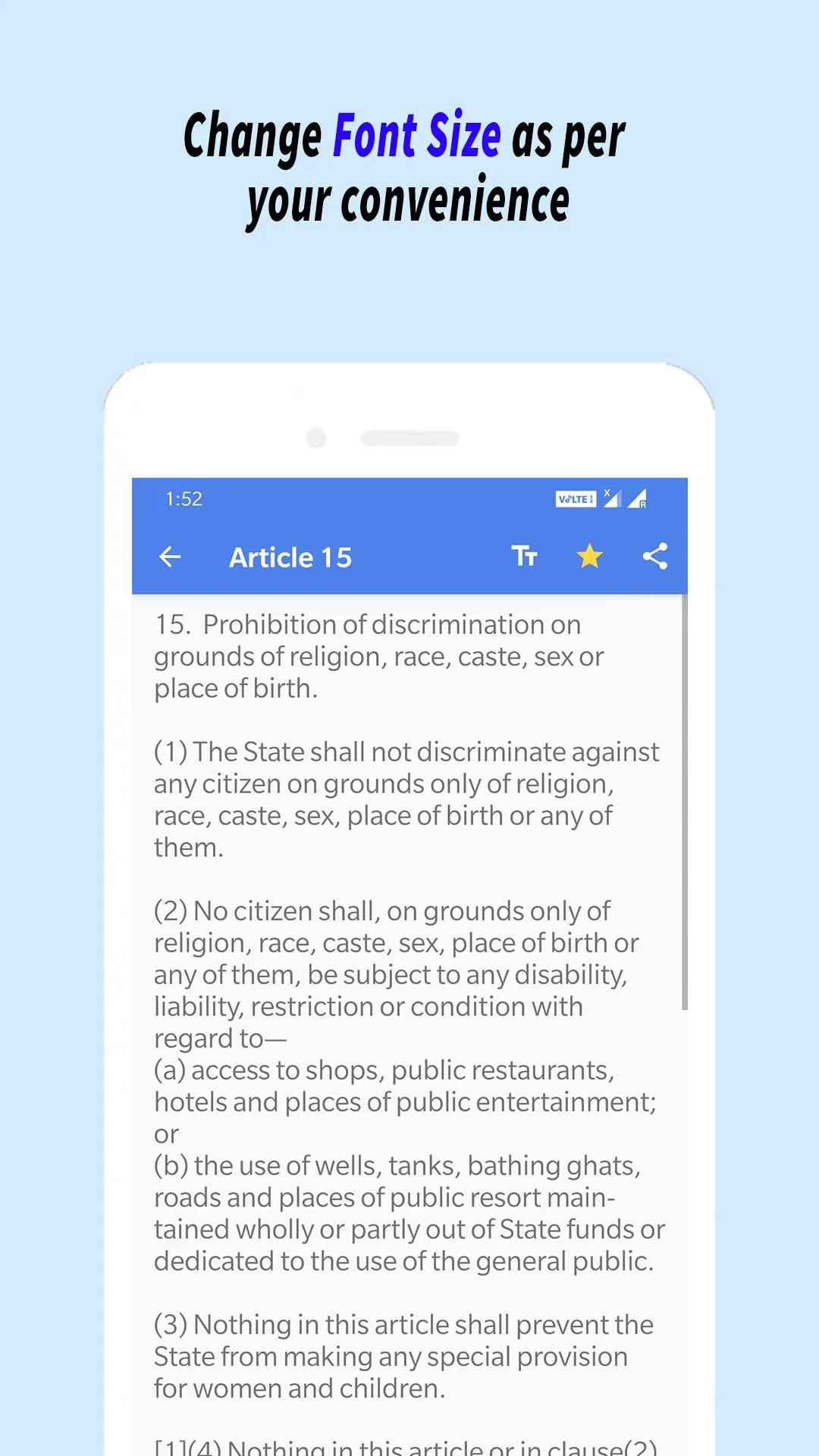 Disclaimer This app does not represent and is not affiliated to any government entity. The inclusion of any governmental references within Constitution India Bare Act is purely for informational purposes and does not imply endorsement or sponsorship by the Government. Content Source - https://legislative.gov.in/constitution-of-india/ In this application Constitution India Bare Act, We have come up with whole constitution in your device with easy to use user interface. Last Amendment to the Indian Constitution was made in 2023 named as The Constitution One Hundred and Sixth Amendment Act 2023. ...