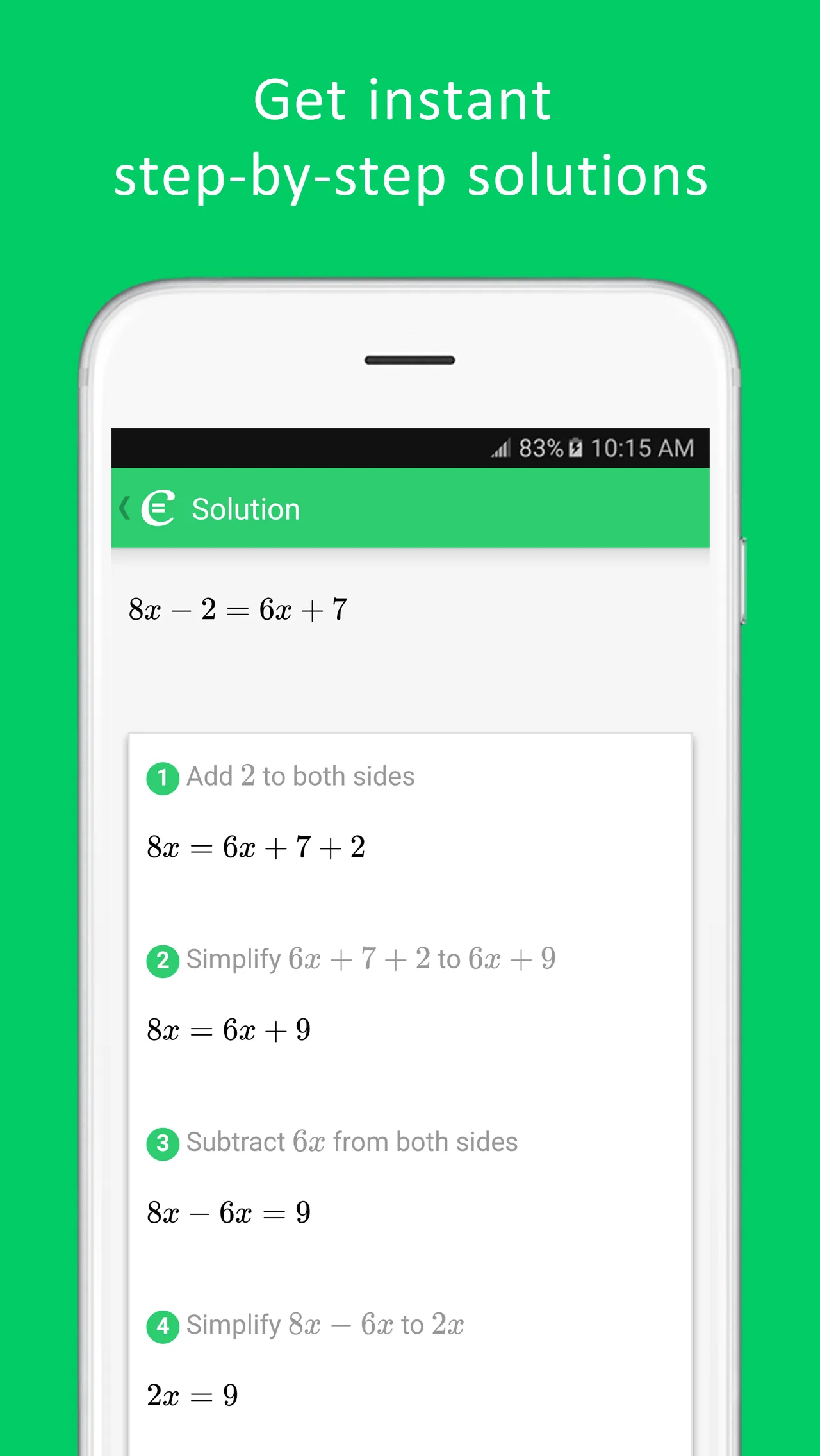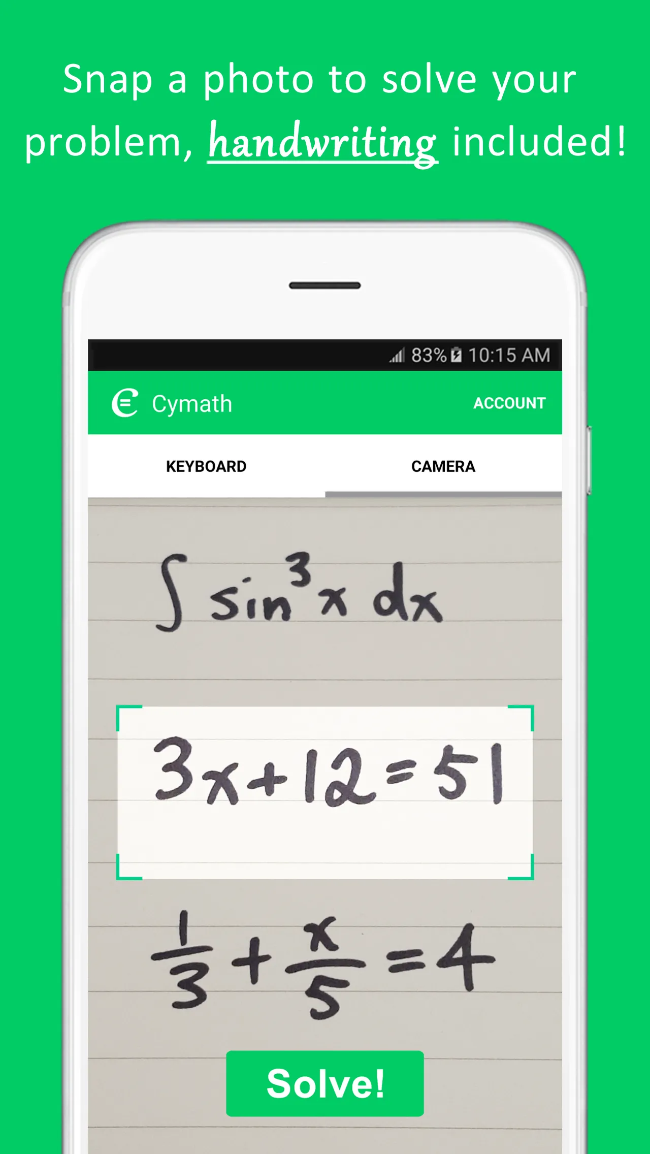 With millions of Cymath.com users worldwide, the Cymath math problem solver app uses the same math engine while letting you solve problems on the go! Just enter a problem from your math homework, and let Cymath solve it for you step-by-step! We provide algebra as well as calculus help. Our math problem solver is designed to help you with your math homework. In addition to homework answers, we also show you how to get there step-by-step. Let Cymath help you with your math homework today! Topics in algebra include: equation solving, factoring, logarithms, exponents, complex numbers, quadratic equations, trigonometry, partial fraction, polynomial division, etc. Topics in calculus include: product rule, quotient rule, chain rule, u-substitution, integration by parts, integration by partial fraction, trigonometric substitution, rationalizing substitution, and much more. We provide math answers and steps for all of the above. ...