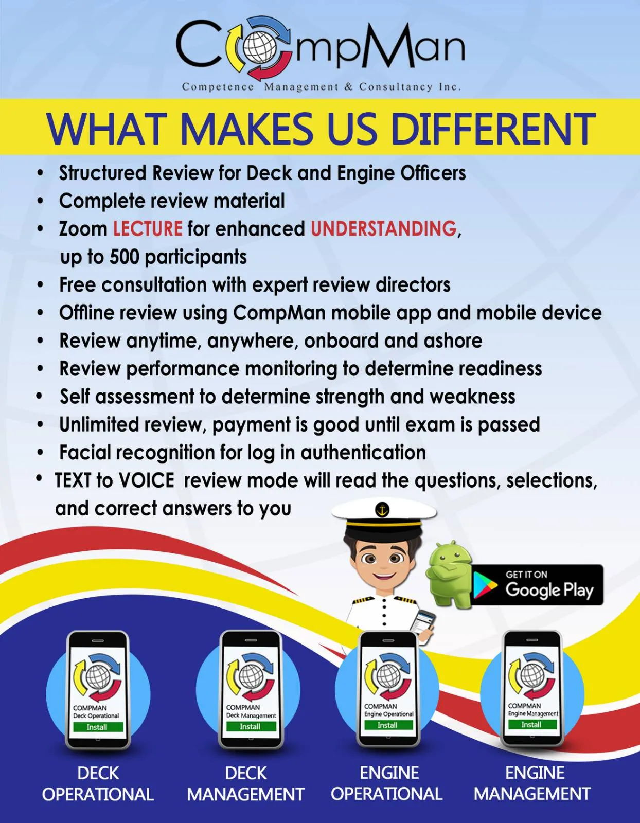 Competence Management (COMPMAN) Consultancy Inc. recognizes the value of Training and Review for the Licensure Examination in building up knowledge and understanding not only to qualify but gain the proficiency and confidence required in carrying out related tasks on board and be able to compete and excel globally. To achieve this goal, COMPMAN took advantage of technology particularly the use of tablets and the web/ internet. COMPMAN also introduced the elements of identifying and monitoring ...