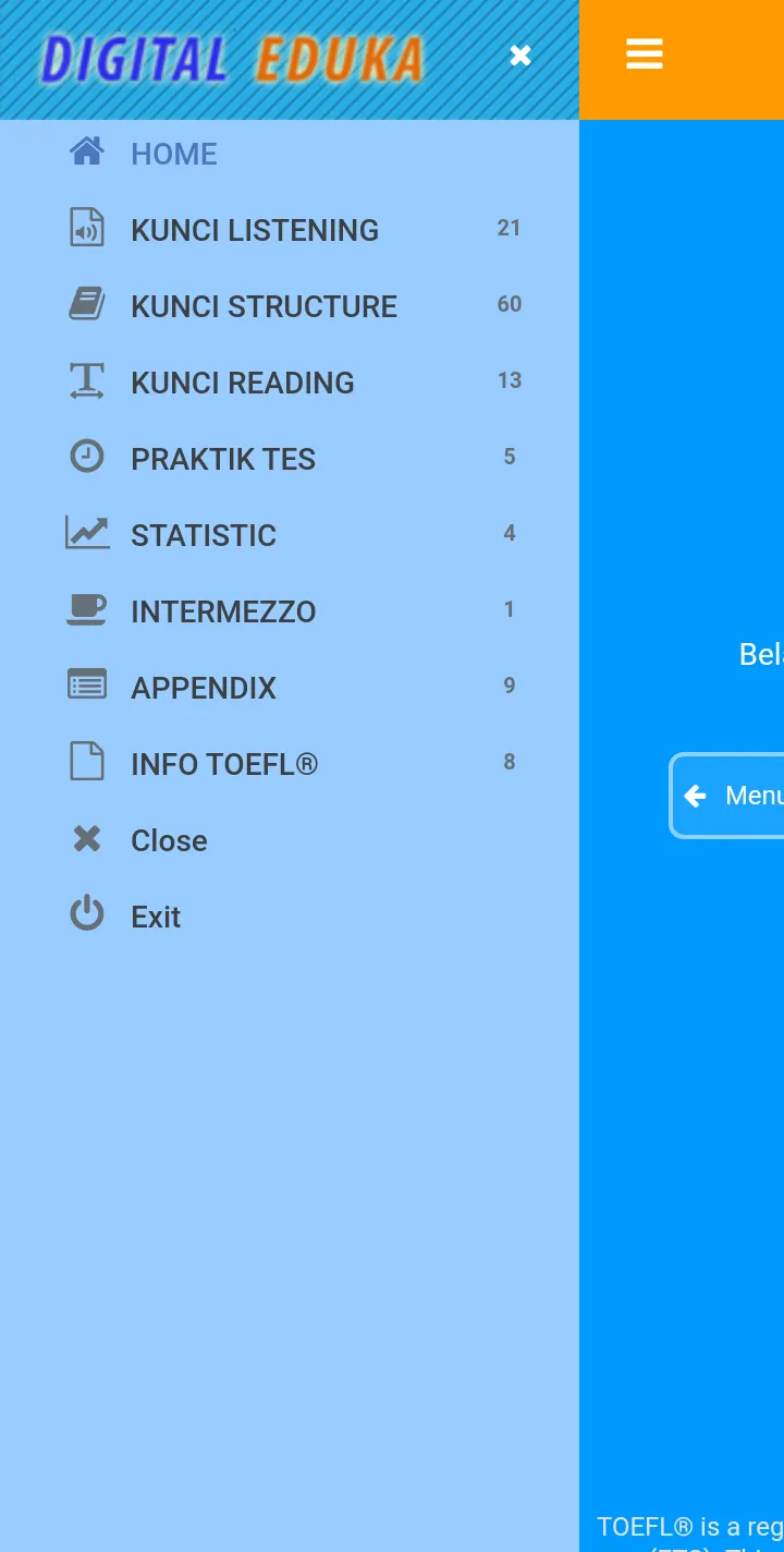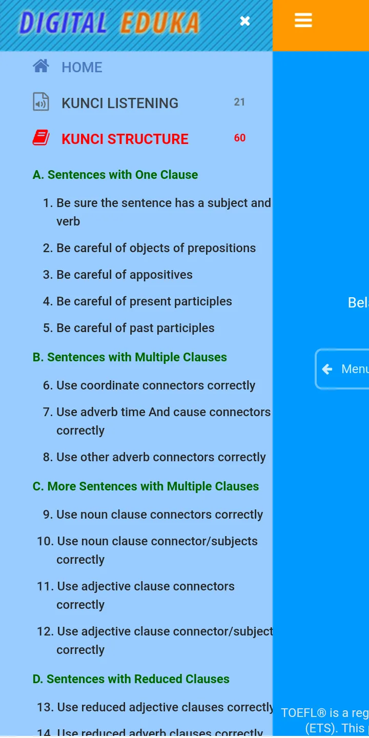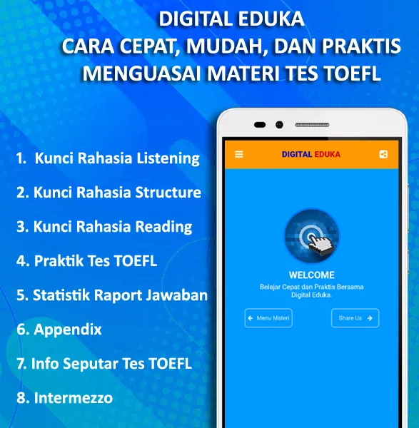 Learning applications to master material and secret keys to answer super complete TOEFL® questions like never before. With this application, you are guaranteed to understand how TOEFL® is tested, the form of TOEFL® questions, and the secret of how to answer TOEFL® questions. The TOEFL® Smart Guide is complete, practical and fast. 1. ASAH MATERIALS - Listening Comprehension (21 Secret Keys to Answering TOEFL® Questions + 225 Sample Questions) - Structure and Written Expression (60 Secret Keys to Answering TOEFL® Questions + 397 Sample Questions) - Reading Comprehension (13 Secret Keys to Answering TOEFL® Questions + 109 Examples of Questions)...