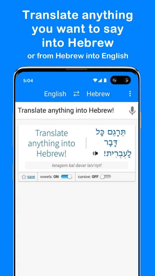 Looking to save precious time & make learning Hebrew a Hebreeeeeze? The Official DoItInHebrew.com Translation & Dictionary (milon) app allows you to: - Translate any sentence or phrase from English into Hebrew, or from Hebrew into English instantly - Type in Hebrew using our intuitive built-in Phonetic or Israeli Standard Keyboards (no need to have a separate Hebrew keyboard installed on your device!) - Speak in Hebrew or English to search for and translate a word or phrase...