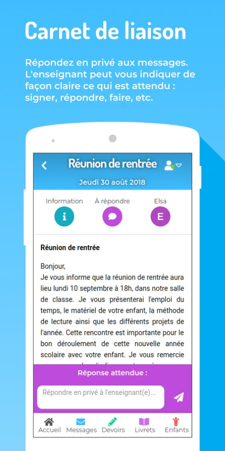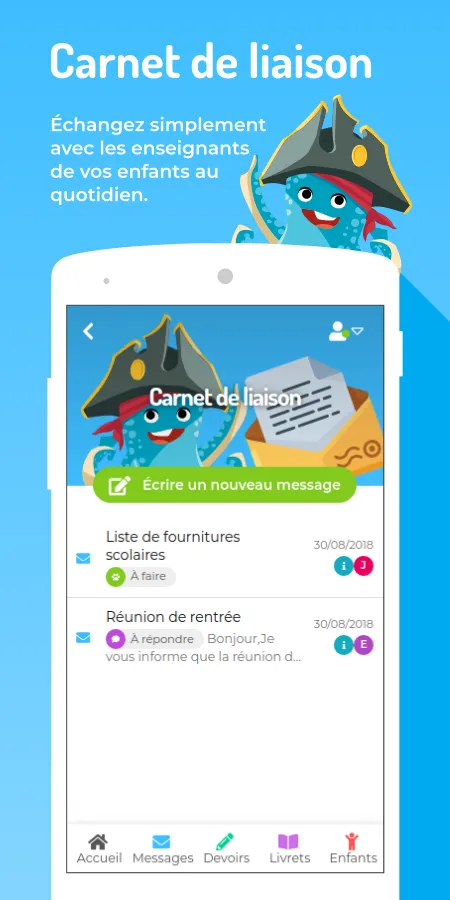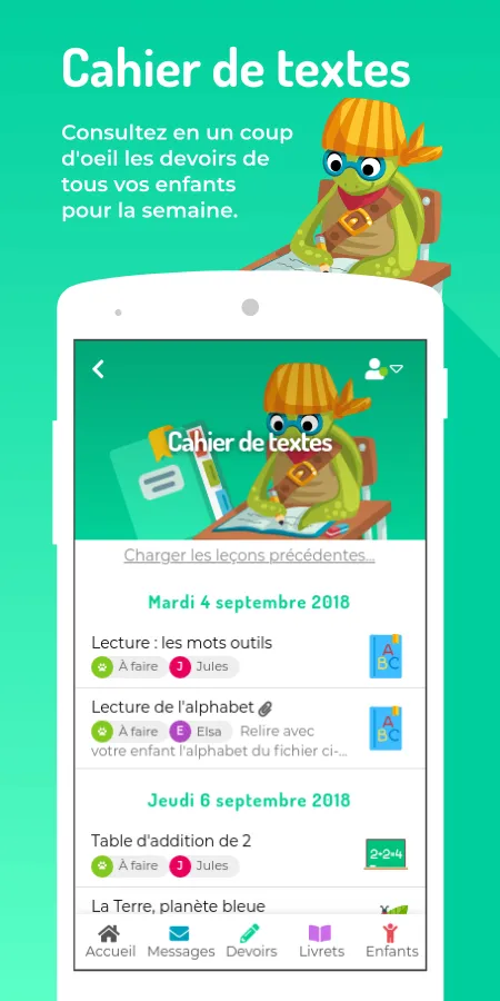 Educartable, the free mobile app that facilitates communication between families and the teaching community. Follow your child during all his primary schooling. Based on requests from kindergartens and elementary schools, Educartable was designed and developed by school teachers. The application makes it possible to centralize all the information communicated by the school. Educartable is: - The log book to simply exchange with your children's teachers daily and access photos of the life of the class....