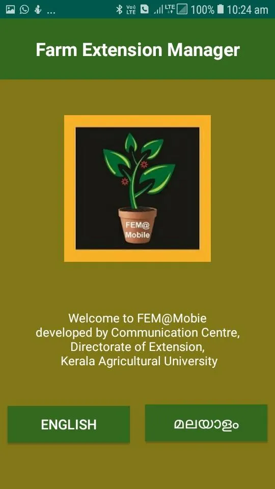 Farm Extension Manager (FEM@Mobile) is a mobile application developed in the field of agriculture. It contains information on 100 essential crops of Kerala. The application is made available in both English and Malayalam languages. It works in its full features in online mode, and also work in offline mode. The application takes care of the needs of both small, marginal and big farmers. There are ten different categories of information covered under the tool. The broad areas of information are crop cultivation, plant protection, organic inputs, agrochemicals, agricultural quiz, video gallery, farm posters, expert support, contact directory and app info. The crops are categorized based on broad groups like spices, vegetables, medicinal plants etc. The crop production aspects cover information on planting, variety, fertilizer, aftercare and harvest. The button on planting operations will give information on seed material, spacing, planting time, method of planting etc. Information on around 800 recommended varieties, are included under the variety section. Around 300 fertilizer recommendations, are presented in straight fertilizer format, and unit area basis and per plant basis. Further, the fertilizer information button will make precise information on how much fertilizer to be applied, when and how. The plant protection part covers symptom and control of over 500 insect pests, 700 plant diseases and 1100 deficiency disorders. The control aspect gives equal emphasis on organic and inorganic methods....