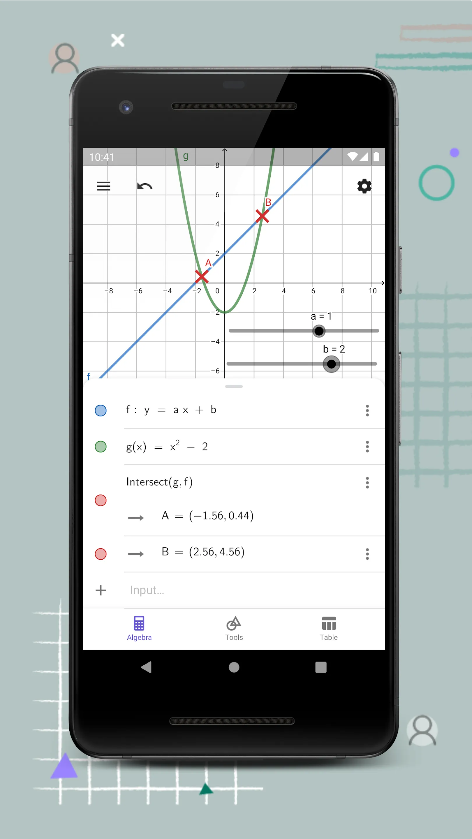 Graph functions, roots, and extrema. Find derivatives and integrals. Create tables of values. Solve equations and 3D math problems. Construct and analyze polygons, circles and conics. Create dynamic geometric constructions in 2D. Use Augmented Reality to explore 3D math objects in real life. Save and share your results. Millions of people around the world use GeoGebra to explore and learn math and science. Come join us! * Plot functions, equations, curves and surfaces in 2D and 3D * Build tables of values * Solve equations * Find derivatives and integrals...