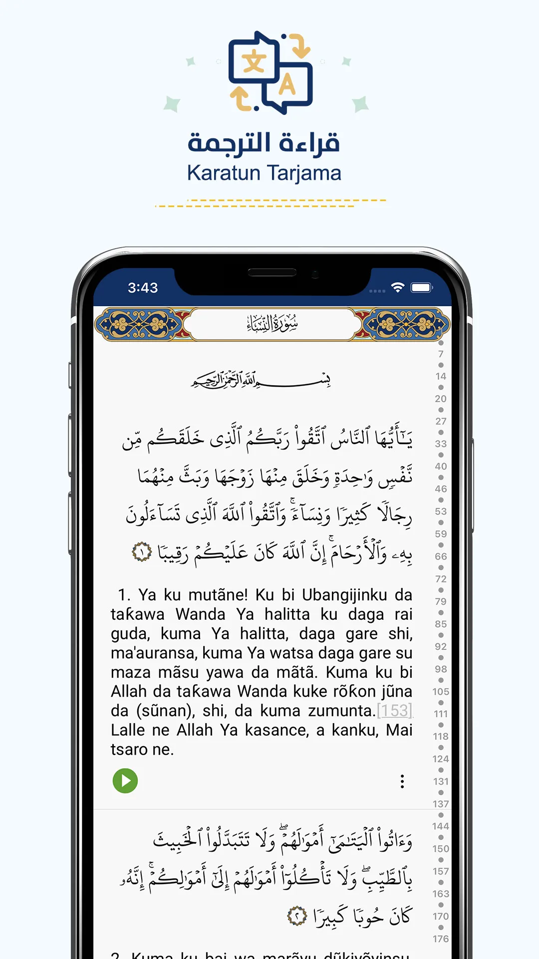 Za ka iya sauke manhajar , kuma ka buɗe Al-ƙur'ani mai Girma tare da Tarjama Halshen Hausa cikin mafi sauƙin hanyoyi da da tsari mai jan hankali da ban-ƙaye, ƙwararren mai zayyanar Al-ƙur'ani na duniya ne ya yi zayyanar cikin ban-ƙaye. Aiki ne da aka yi shi kyauta, ba tare da tallace-tallace ba a matsayin waƙafi domin Allah Maɗaukakin Sarki. ***Keɓance-keɓancen Manhajar:*** - Sauƙin amfani ƙaramar fuska tare da damarmaki masu yawa - Binciken gaggawa da sauri Bincike a Nassoshin Alƙur'ani da - Sunayen surori da Juzi'ai...