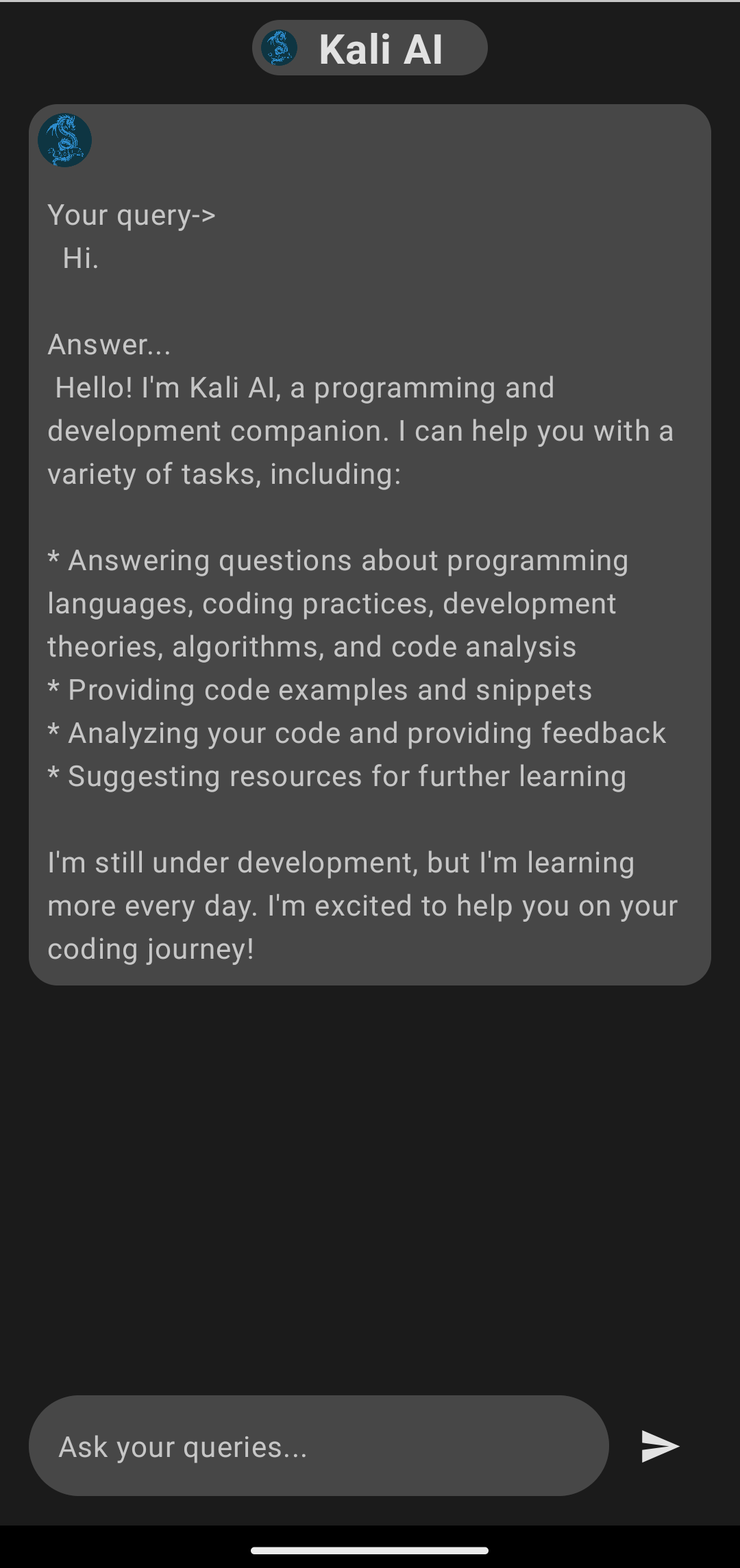 Kali AI, your ultimate companion for beginner coders! 🤖 This Android app, built with Jetpack Compose and Kotlin, harnesses the power of Google's Gemini Pro model to provide intelligent assistance and guidance to programming enthusiasts at every step of their learning journey. It is designed to bridge the gap between aspiring coders and their coding goals. Whether you're a complete beginner or looking to level up your skills, Kali AI offers personalized insights, explanations, and support tailor...